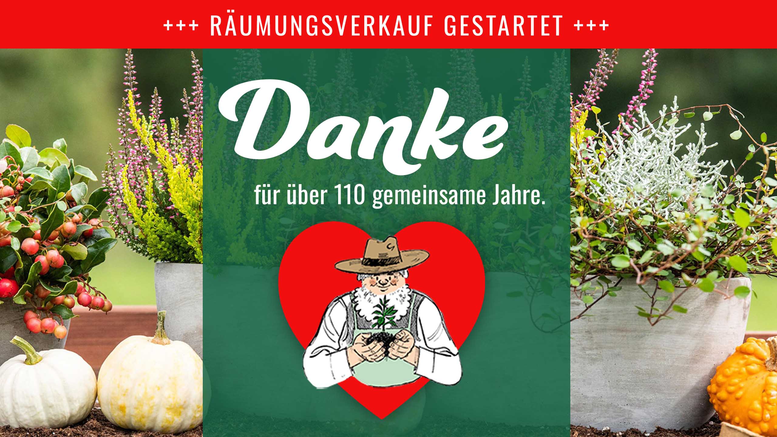 Wir bleiben unserem Qualitätsanspruch bis zum letzten Tag treu. Sie erhalten von uns weiterhin unsere Pflanzen in der gewohnten Gärtnerqualität. Denn auf eines können Sie sich verlassen: Ihr Gärtner ist bis zum Schluss für Sie da!