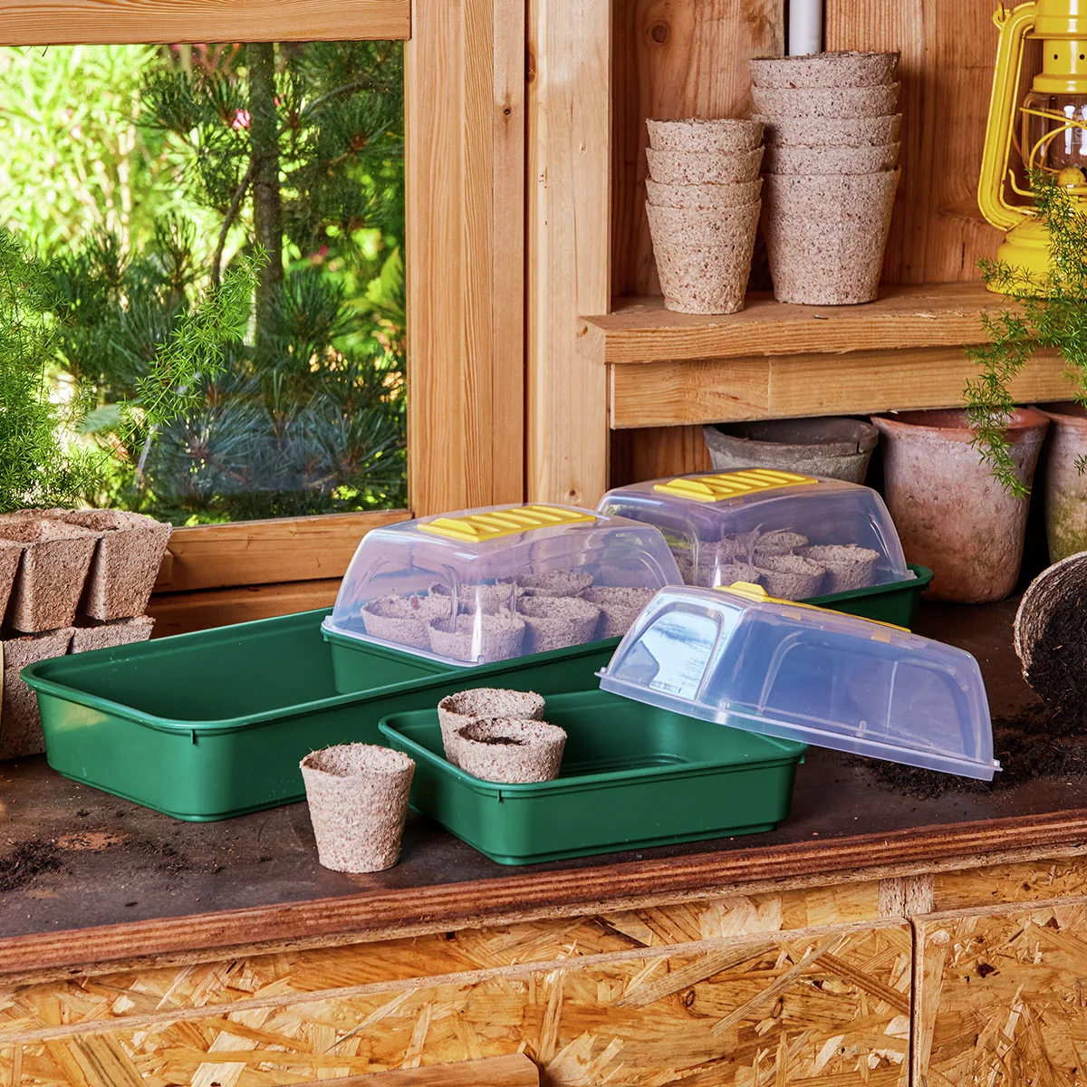 Einer Saatschale (66 x 18 x 9 cm) mit geschlossenem Boden und drei Zimmergewächshäusern (21 x 17,5 x 12 cm) mit Belüftungsschieber im Deckel und Perforation zur Entwässerung im Boden.