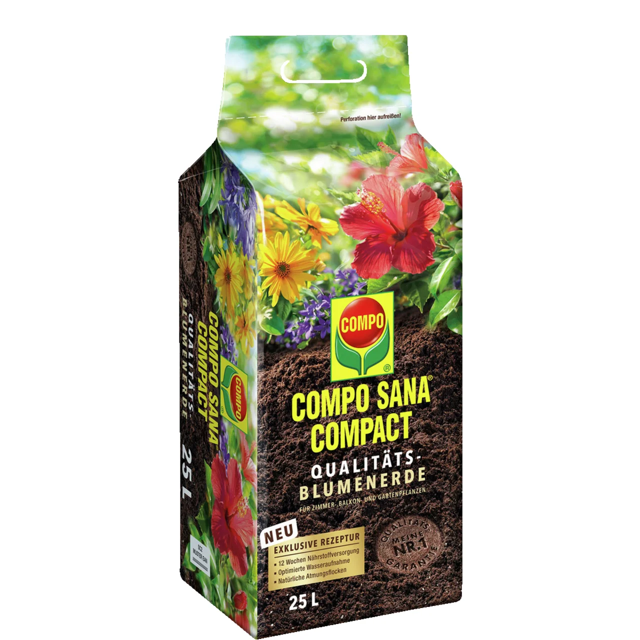 Mit der Compo Sana® Qualitäts-Blumenerde bringen Sie Ihre Zimmer-, Balkon- und Gartenpflanzen zum Strahlen! Dank ihrer lockeren, luftigen Struktur fördert sie ein kräftiges Wurzelwachstum und schafft so eine prima Basis für gesunde Pflanzen. Der enthaltene Dünger versorgt die Pflanzen für ganze 12 Wochen mit allen wichtigen Haupt- und Spurennährstoffen. Mit 50 % weniger Gewicht als herkömmliche Erden ist die Compo Sana® Qualität-Blumenerde leicht besonders komfortabel zu transportieren und dazu auch noch wiederverschließbar. Und weil hier nicht nur die Inneren Werte zählen besteht die Verpackung zu über 60 % aus recyceltem Kunststoff – für mehr Nachhaltigkeit. Setzen Sie auf Qualität, die rundum begeistert!