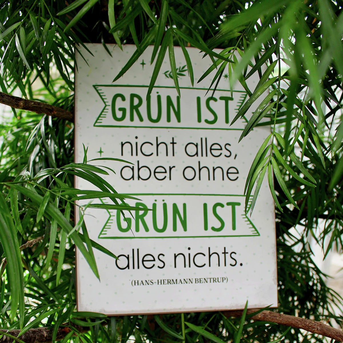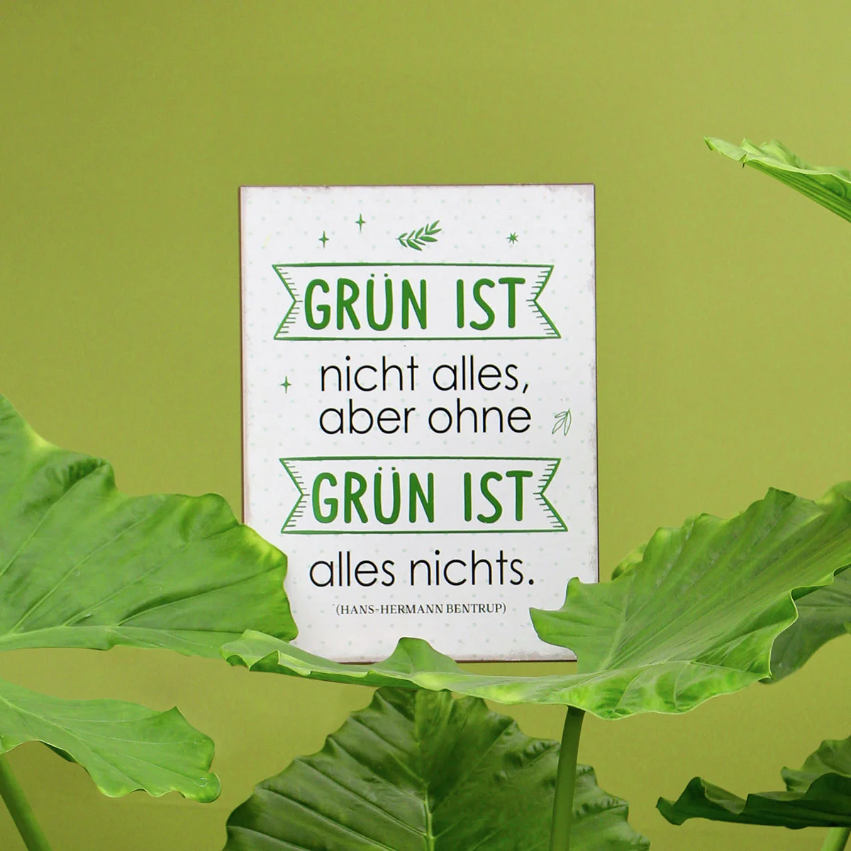 Auf diesem Metall-Schild sieht der Spruch dazu auch noch ausgesprochen gut aus! Die grünen und schwarzen Buchstaben sind von einem verspielten, zartgrün gepunkteten Hintergrund unterlegt.