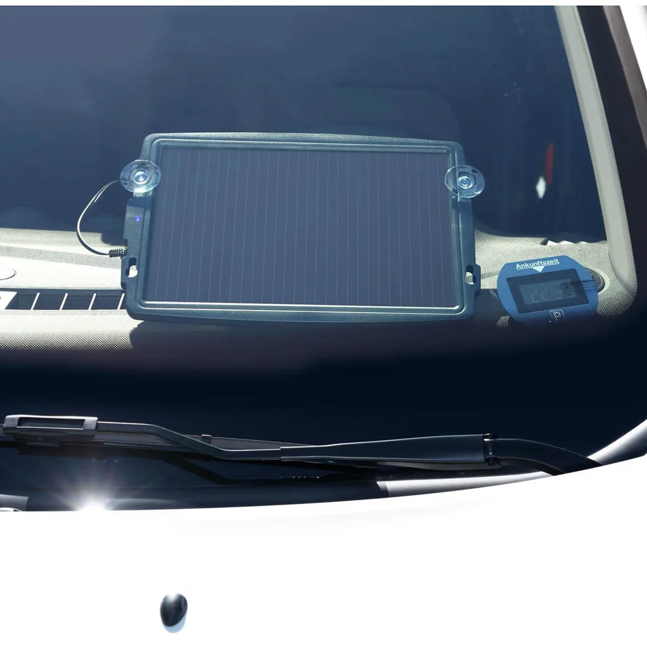 Damit ist jetzt Schluss! Schließen Sie das Solarpanel einfach am Zigarettenanzünder an und platzieren Sie es in der Sonne (z.B. auf der Ablage). Ein sanfter Ladestrom hält Ihre Batterie ab sofort "bei bester Laune".