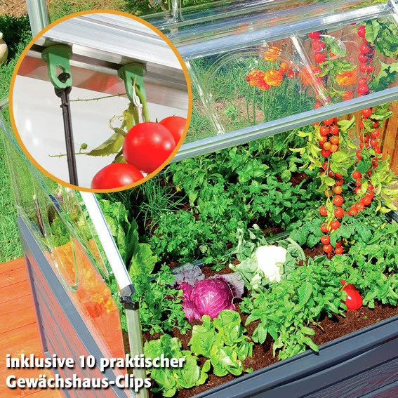 Durch die Abdeckung aus unzerbrechlichem Polycarbonat werden über 90 % des Sonnenlichts direkt an die Pflanzen geleitet, was für ein außergewöhnliches Wachstum sorgt. Zudem ist mit der Abdeckung eine flexible Lüftungsmöglichkeit gegeben. Der hochwertige, rostfreie Aluminiumrahmen sorgt für viel Stabilität und rundet die Premiumqualität dieses Gewächshauses auch optisch ab. 10 Clips im Lieferumfang enthalten.