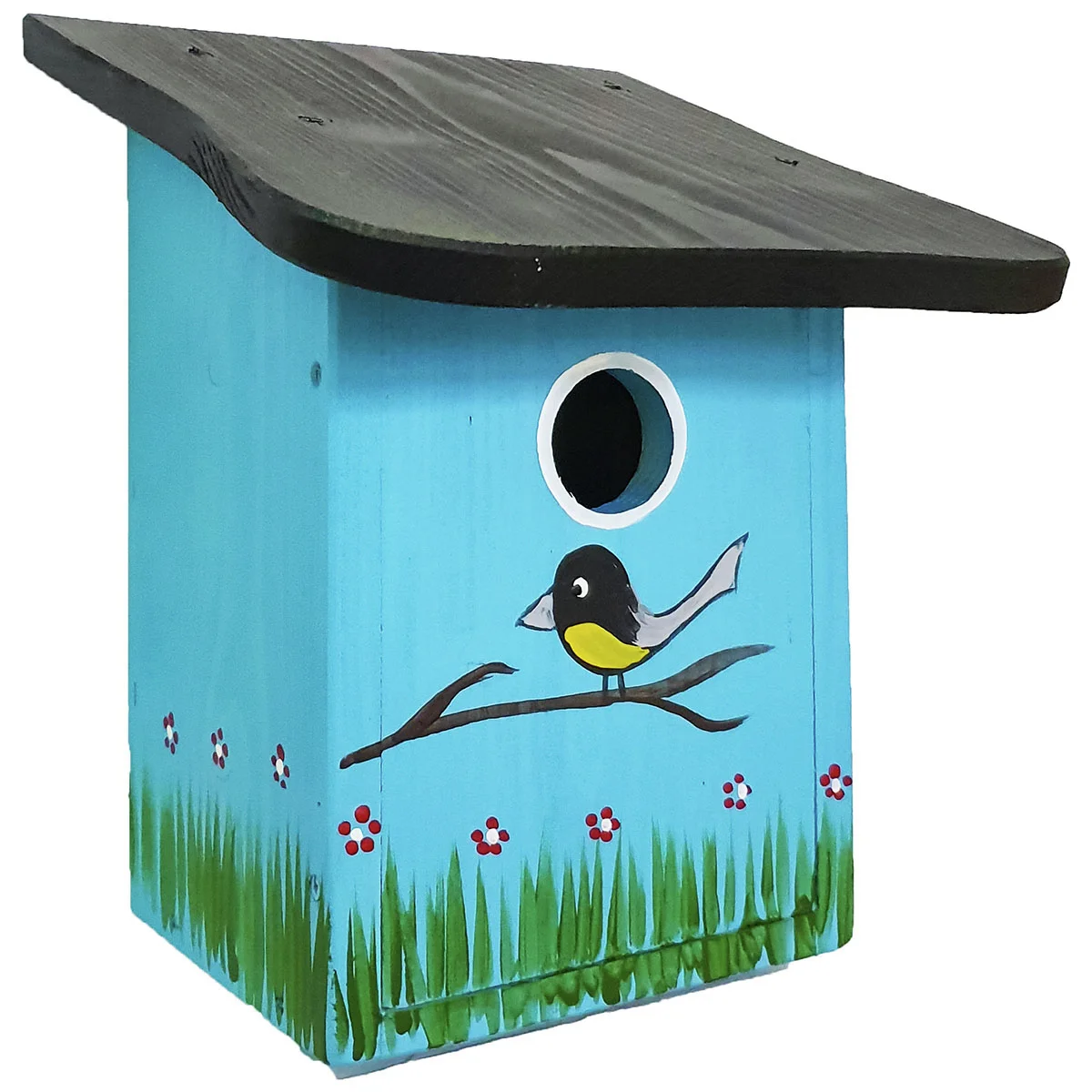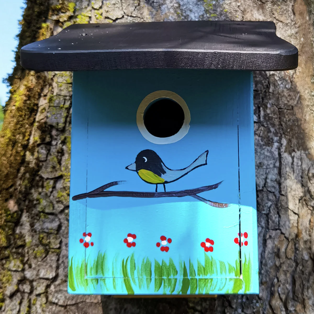 Treffender kann man es gar nicht sagen - dieser Nistkasten ist ein echtes Kohlmeisenparadies. Mit einem Einflugloch in der richtigen Größe und genügend Platz im Inneren erfüllt es alle Meisenwünsche. Und der Mensch freut sich über das dekorative Äußere mit den bunten Farben sowie seinen Anteil am Naturschutz. Perfekt! Aus Holz, zum Hängen, inkl. Haken.