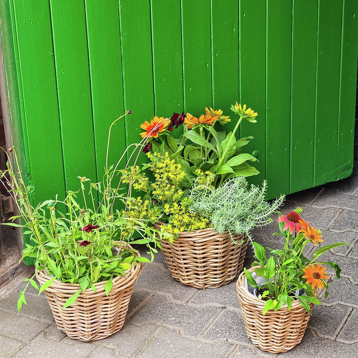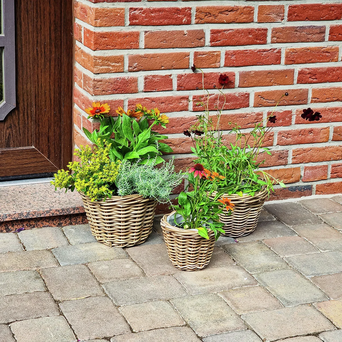 Ob im Frühjahr mit fröhlichen Narzissen, im Sommer mit einer leuchtenden Petunie oder prächtige Amaryllis im Winter: Dieses Übertopftrio aus Rattan-Geflecht setzt Ihre Pflanzen zu jeder Jahreszeit perfekt in Szene. Innen sind die naturbraunen Töpfe wasserdicht mit robuster Folie ausgeschlagen. Rattan ist ein Naturmaterial, kleine Farbvariationen tragen zu seinem einzigartigen Charme bei.