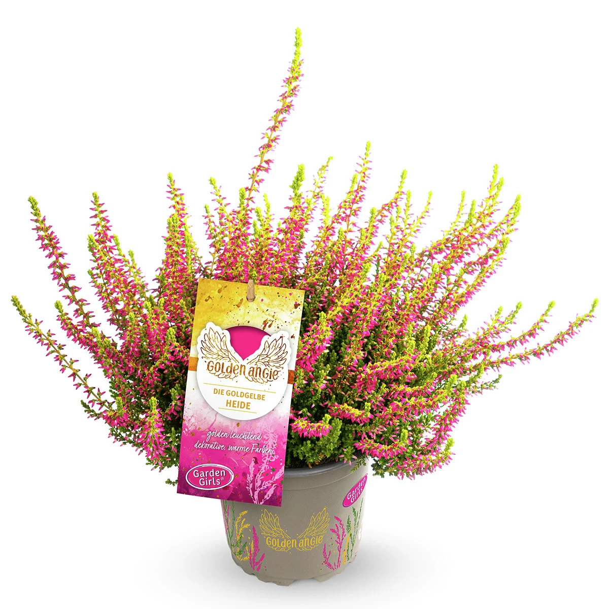 Einfach wunderschön ist diese Knospenheide mit ihrer beruhigenden, harmonisch-warmen Farbgebung aus leuchtend goldgelbem Laub und roten Knospen, einer Farbwirkung, die sich z.B. mit passender goldener Deko zusätzlich unterstreichen lässt. An einem sonnigen Standort wächst sie besonders gut und beglückt mit einem zweiten Austrieb nach einem Rückschnitt im Frühjahr.
