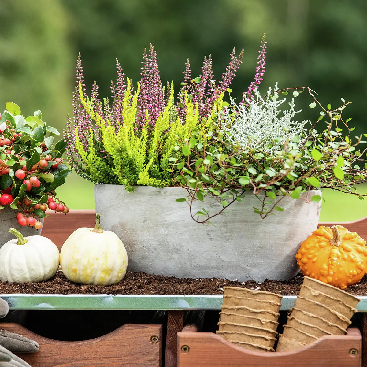 Dieses Set besteht aus einer Knospenheide Gardengirls® Zelda in gelb, einer rosa Knospenheide Gardengirls®, Mühlenbeckia und einer Stacheldrahtpflanze. Zusammen schaffen diese Pflanzen eine abwechslungsreiche und attraktive Herbstbepflanzung.