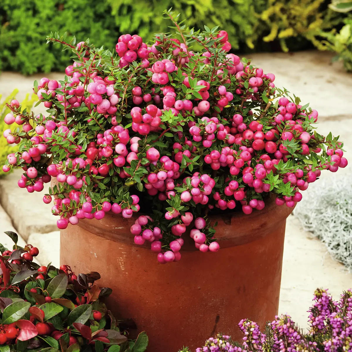 Purpurea - wie dieser Zwergstrauch auch genannt wird, eignet sich z.B. für Heidegärten einfach perfekt. Zuerst erscheinen die glänzenden dunkelgrünen Blätter dann folgen ab Mai/Juni schöne grünweiße Glöckchen. Die pinken Zier-Beeren folgen dann im September.