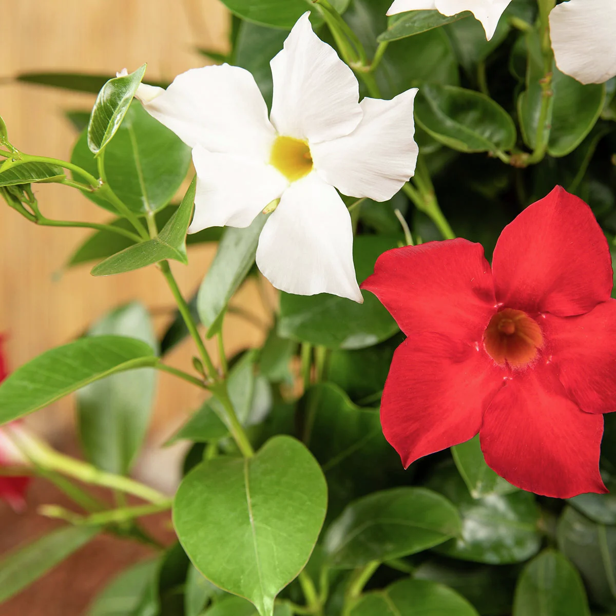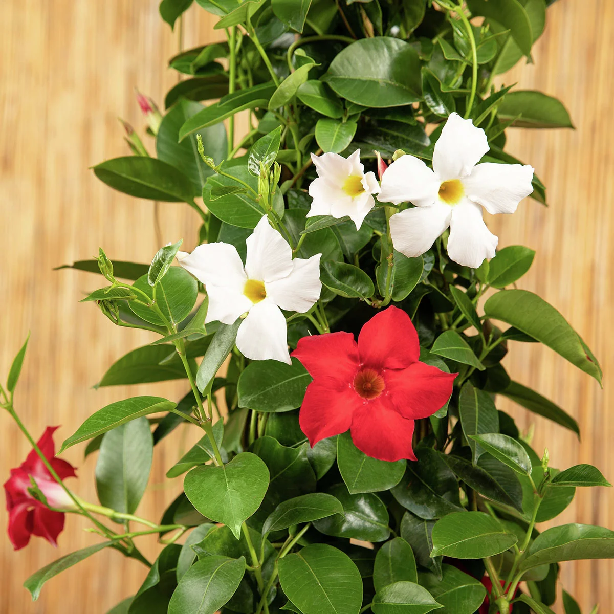 Wer die Dipladenia kennt, weiß, dass der Kletterstrauch eine Bereicherung ist für Terrasse und Balkon: rote und weiße Blütenkelche (Blüten werden bis zu 5 cm groß), tiefgrüne fleischige Blätter, dazu sehr wüchsig und pflegeleicht. Ihre Schönheit bewahrt sie sich den gesamten Sommer lang bis spät in den Herbst hinein. An einem hellen Standort kann die Dipladenia auch im Zimmer gehalten werden – ganzjährig! Überstehende Ranken können problemlos abgeschnitten werden. Lieferung ohne Übertopf.