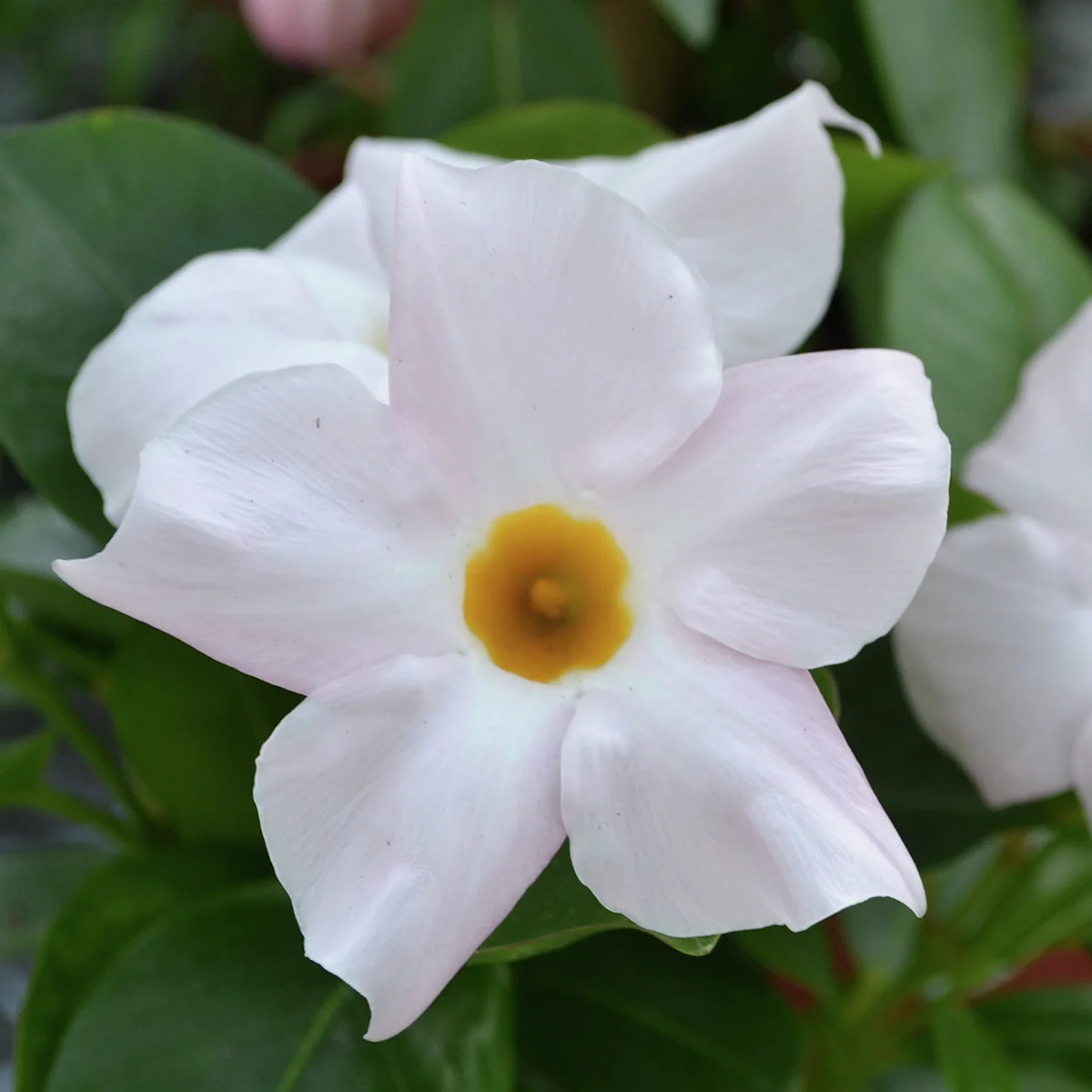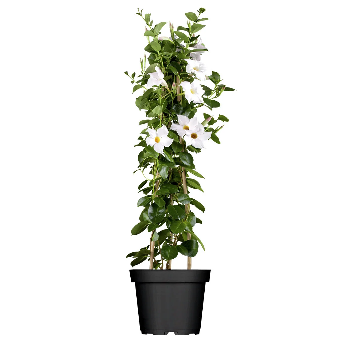 Wer die Dipladenia kennt, weiß, dass der Kletterstrauch eine Bereicherung ist für Terrasse und Balkon: weiße Blütenkelche (Blüten werden bis zu 5 cm groß!), tiefgrüne fleischige Blätter, dazu sehr wüchsig und pflegeleicht. Ihre Schönheit bewahrt sie sich den gesamten Sommer lang bis spät in den Herbst hinein. An einem hellen Standort kann die Dipladenia sogar im Zimmer gehalten werden – ganzjährig! Überstehende Ranken können problemlos abgeschnitten werden.