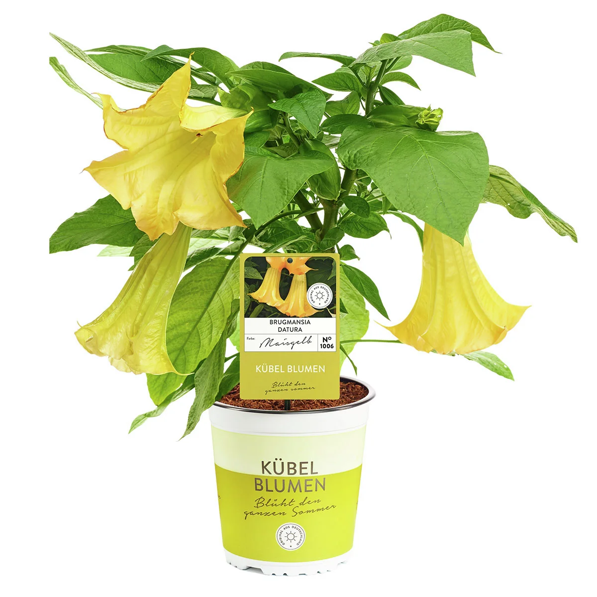 Volle Aufmerksamkeit gilt der Gelben Engelstrompete. Denn ihre Blüten formen sich zu beeindruckenden Kelchen. Ein Übersehen ist nicht möglich! Dazu stehen sie im reizvollen Kontrast zu den fleischigen tiefgrünen Blättern. Ein reizvoller Anblick, der Ihnen einen gesamten Sommer lang und sogar bis spät in den Herbst erhalten bleibt. Sehr wüchsig und pflegeleicht. Ein heller, sonniger bis halbschattiger Standort ist das beste für sie.