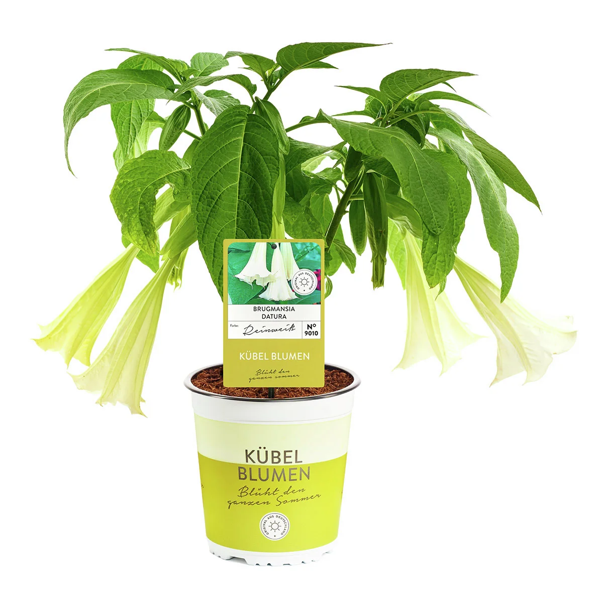 Volle Aufmerksamkeit gilt der Weißen Engelstrompete. Denn ihre Blüten formen sich zu beeindruckenden Kelchen. Ein Übersehen ist nicht möglich! Dazu stehen sie im reizvollen Kontrast zu den fleischigen tiefgrünen Blättern. Ein reizvoller Anblick, der Ihnen einen gesamten Sommer lang und sogar bis spät in den Herbst erhalten bleibt. Sehr wüchsig und pflegeleicht. Ein heller, sonniger bis halbschattiger Standort ist das beste für sie.