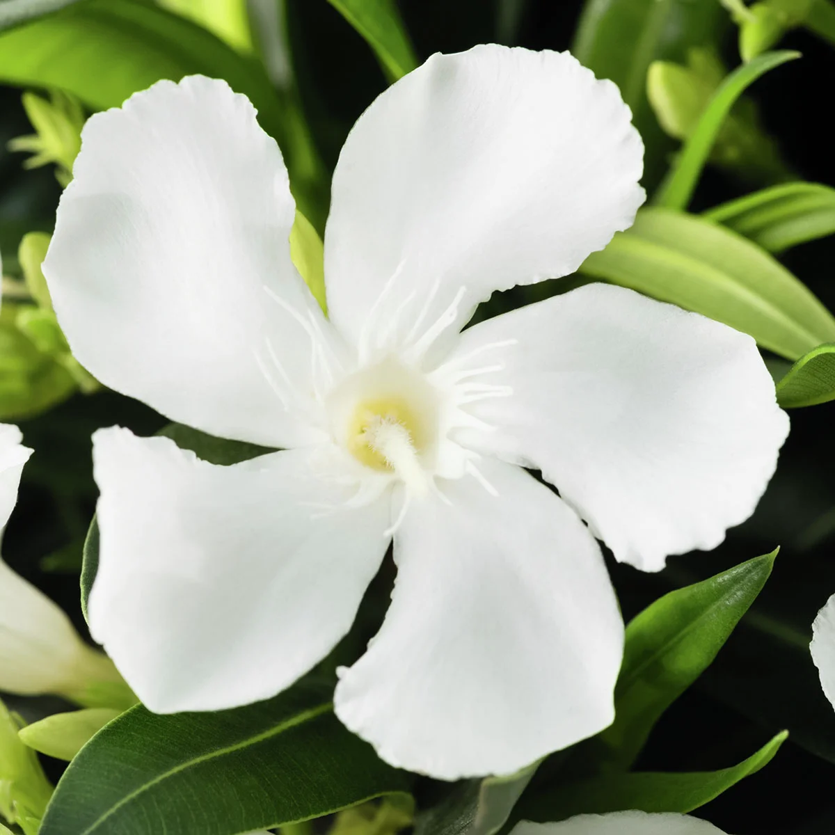 Lassen Sie sich vom mediterranen Zauber des weißen Oleanders verzaubern! Seine strahlend weißen Blüten, die von Juni bis Oktober erscheinen, machen ihn zu einem besonderen Blickfang und stehen in reizvollem Kontrast zum grünen Laub. In unseren Breitengraden fühlt sich die am Mittelmeer beheimatete Pflanze im Kübel am wohlsten und verbreitet im Garten, auf dem Balkon oder der Terrasse sein südländisches Flair. Auch gut als Wintergartenpflanze geeignet.