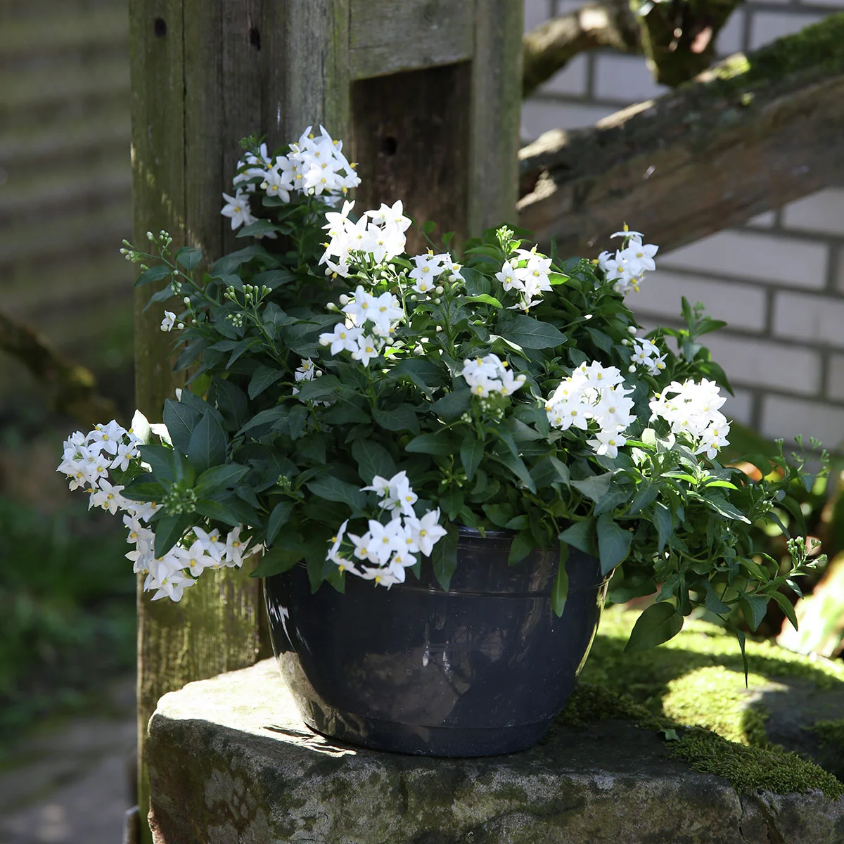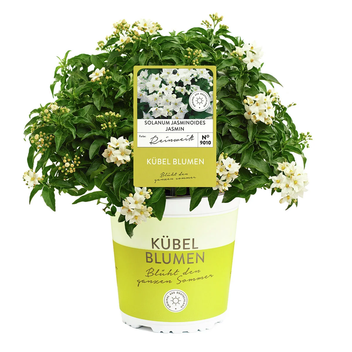 Wer sich schon immer mal Jasmin für Balkon oder Terrasse gewünscht hat, der hat jetzt allen Grund zur Freude! Denn selbst im Kübel beeindruckt die Schönheit durch schneeweiße sowie sternförmige Blütendolden. Vor dem tiefgrünen Laub kommen sie sogar noch mehr zur Geltung. Elegant rankende Kübelpflanze für sonnige bis halbschattige Standorte. Mehrjährig bei Überwinterung im Haus.