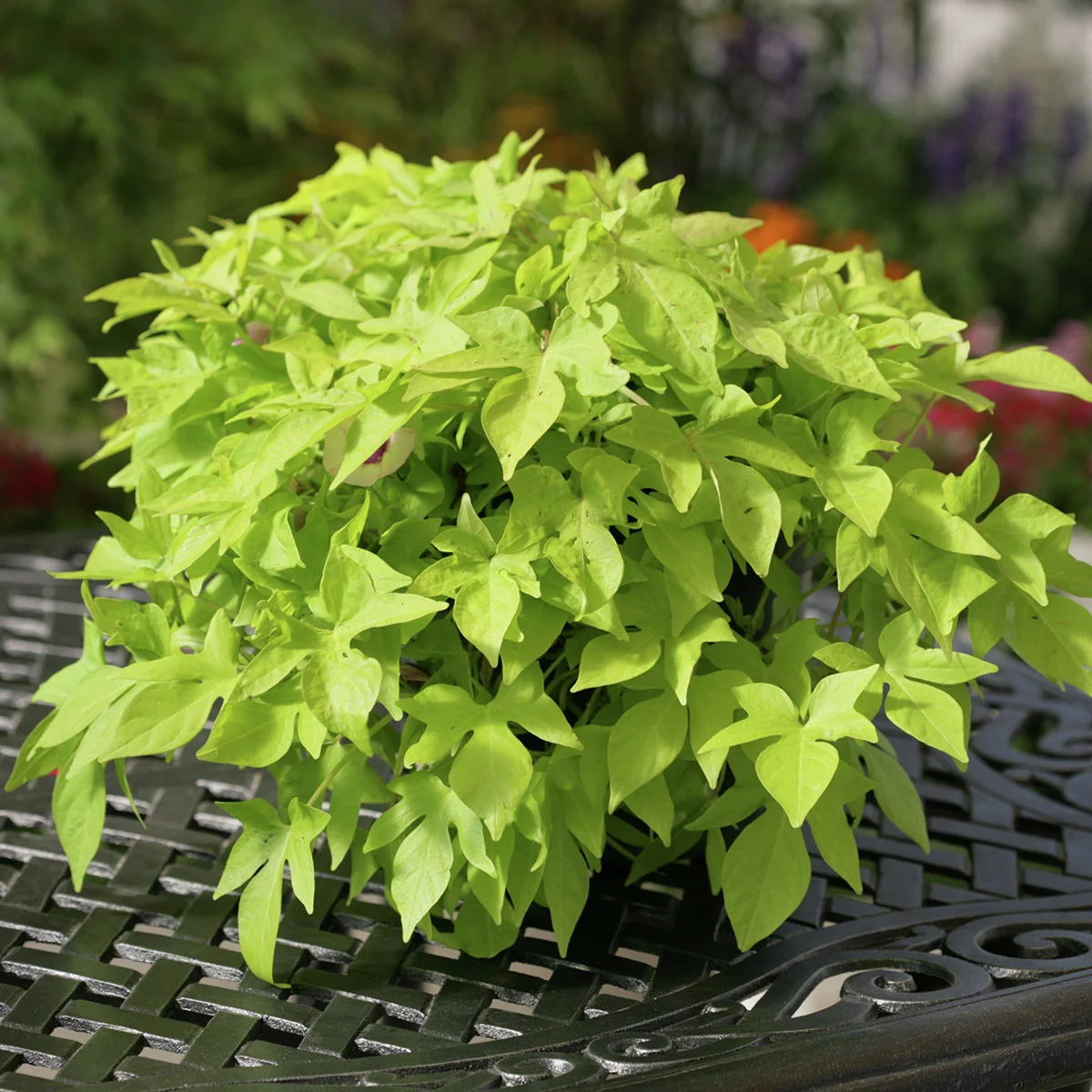 Die Kiwigrüne Blattschmuck-Ipomoea, bekannt als eine dekorative Form der Süßkartoffel, ist eine attraktive Zierpflanze, die sich durch ihre lebhaft grünen, herzförmigen Blätter auszeichnet. Diese Sorte der Ipomoea batatas zeichnet sich durch einen kriechenden oder hängenden Wuchs aus, der sie ideal für Hängekörbe, Kübel oder als Bodendecker macht. Während der warmen Monate kann sie auch kleine, zarte Blüten entwickeln, die jedoch meist hinter dem spektakulären Laub zurückstehen.