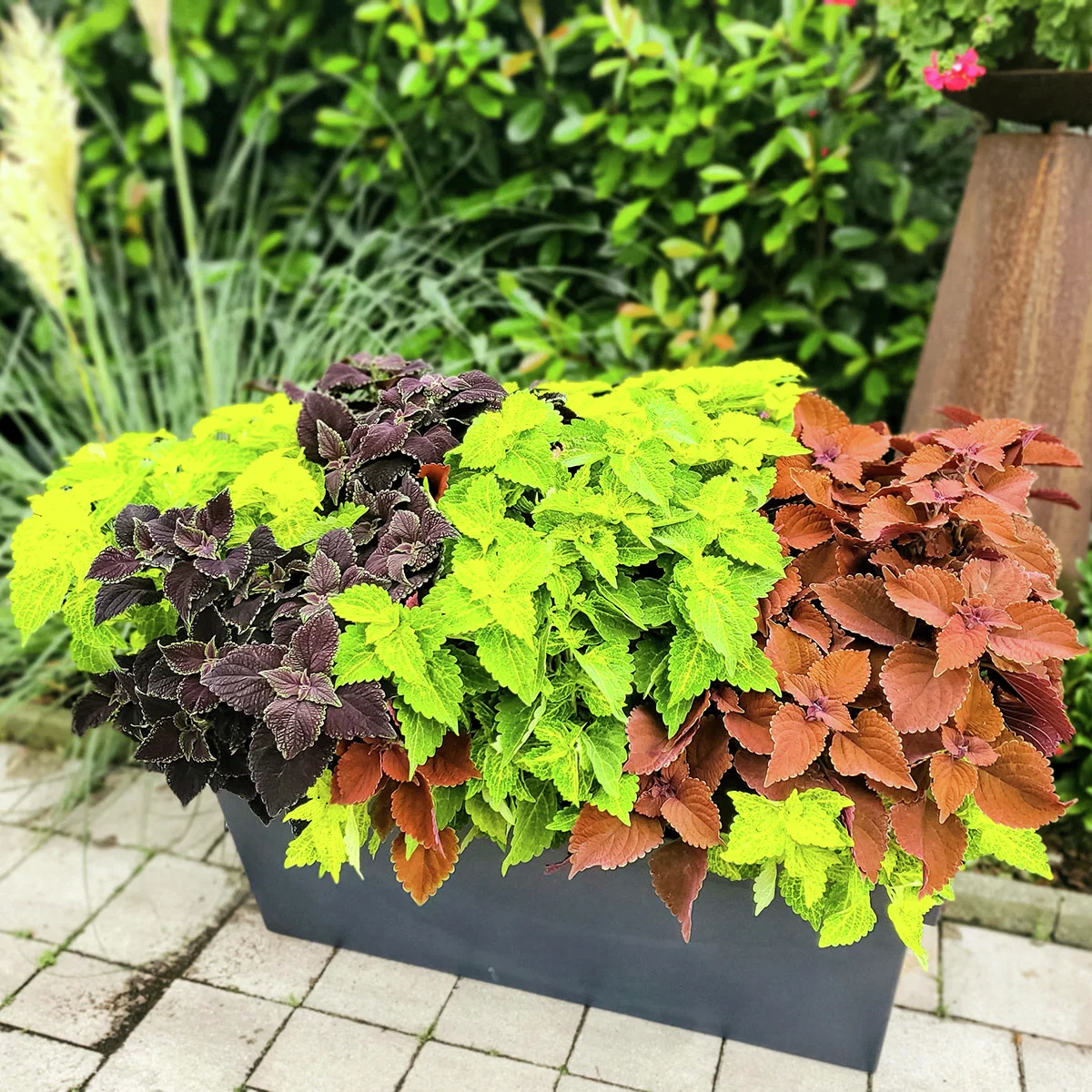 In außergewöhnlichen Farben zeigen sich die rundum gezahnten Blätter dieser Buntnesseln. Damit schmücken die Blattschmuckschönheiten nicht nur Beete, Terrassen und Balkons, auch als Zimmerpflanzen machen sie eine gute Figur und sind noch dazu ausgesprochen pflegeleicht! Blaue Blüten setzen von Juni bis Oktober zusätzlich sehenswerte Akzente.