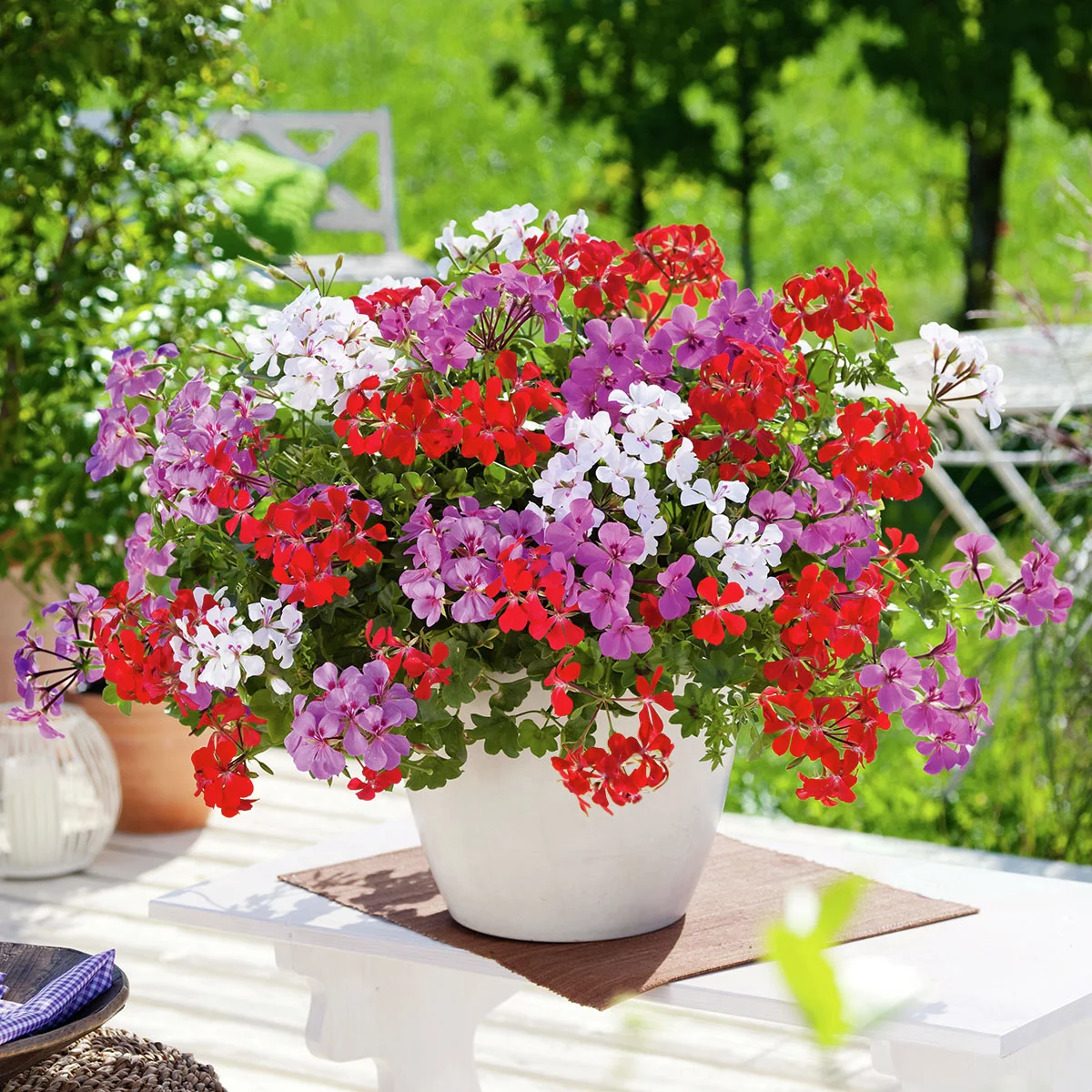 Bunte Farben bringen erst Schwung in den Garten. Drum gibt es dieses tolle Trio der schönsten Hängegeranien fertig in 1 Topf für Sie vorgezogen. Zusammen leuchten die bunten Dauerblüher wirklich effektvoll in Weiß, Rot und Violett. Mit extragroßen Blüten. Frühblühend.