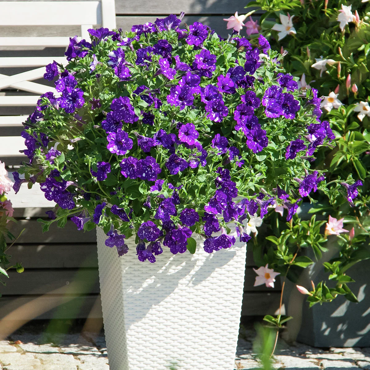 Die Petunie Night Sky® ist bekannt für ihre spektakuläre Blütenpracht, die jedem Garten oder Balkon ein kosmisches Flair verleiht. Diese Sorte zeichnet sich durch ihre einzigartigen Blüten aus, die ein tiefes Violett mit weißen Sprenkeln aufweisen, ähnlich einem sternenklaren Nachthimmel. Die Pflanze wächst buschig und breit und erreicht eine Höhe von etwa 25 bis 30 cm bei einer Breite von 30 bis 40 cm. Die Blätter sind mittelgrün, leicht behaart und ergänzen das farbenfrohe Blütenspiel von Frühjahr bis in den späten Herbst.