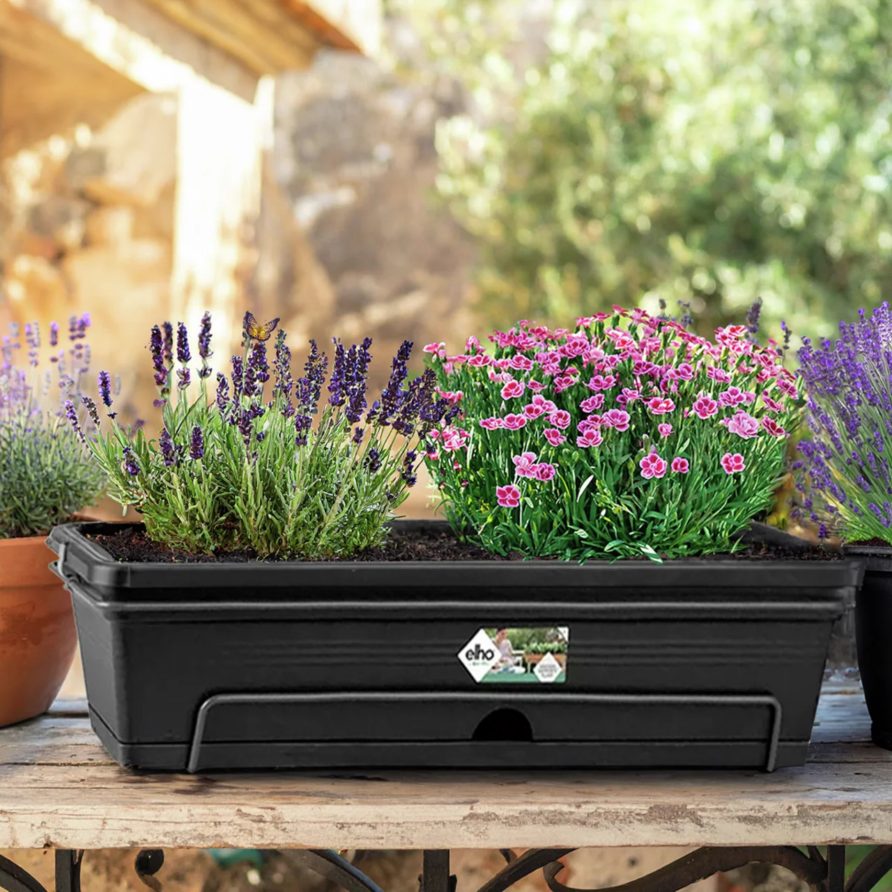 Ergänzt wird das Pflanzduo durch einen Balkonkasten aus recyceltem Kunststoff mit praktischer Metallhalterung. Die integrierte Gießöffnung erleichtert das Bewässern – und bei Regen sorgt der Untersetzer für sauberen Wasserablauf. So bleibt alles im Fluss – ganz ohne Gießstress.
