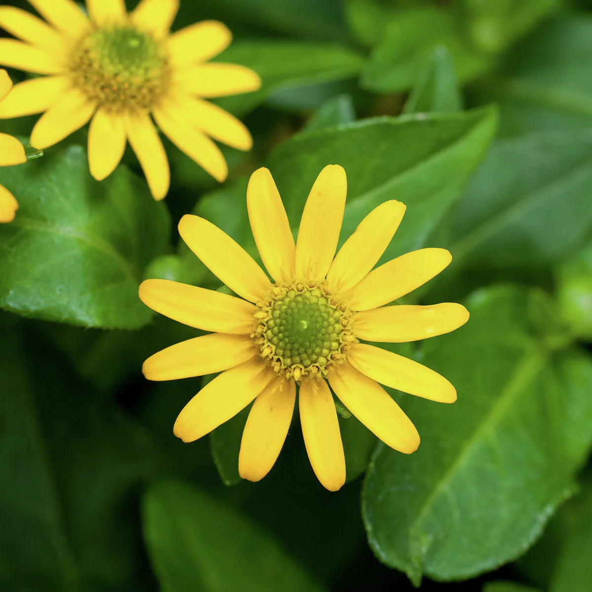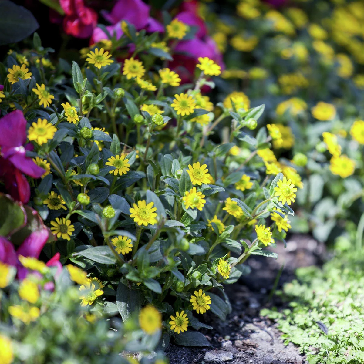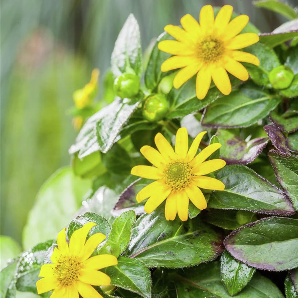Das Gelbe Husarenknöpfchen, auch bekannt als Sanvitalia procumbens, ist eine charmante, bodendeckende Pflanze, die sich durch ihren üppigen, kriechenden Wuchs auszeichnet. Sie erreicht eine Höhe von etwa 15 bis 20 cm und breitet sich gerne flächig aus. Die kleinen, glänzenden Blätter bilden einen dichten Teppich, der von Juni bis in den späten Herbst hinein mit einer Fülle von leuchtend gelben Blüten übersät ist. Diese sonnig-gelben Blüten ähneln kleinen Sonnenblumen und haben einen dunklen, fast schwarzen Mittelpunkt, der einen reizvollen Kontrast bietet.
