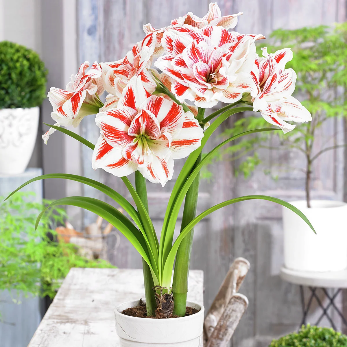 Zuckerstangen kennt man eigentlich als Tannenbaumschmuck – diese gehören aber auf die Fensterbank! Dort wird Ihnen Bright Nymph, die spektakulär gefüllt blühende Amaryllis, bis zum Frühling ein wahres Farbspektakel präsentieren. Auf kurzen kräftigen Stielen erstrahlen ihre eindrucksvollen Blüten in leuchtendem Weiß-Rot.