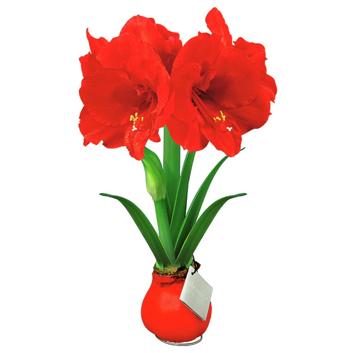 Pflanzung: Die Zwiebel der Wax-Amaryllis ist mit einem Wachskleid ummantelt und muss nicht gepflanzt werden. Sie benötigen daher weder Topf noch Erde und auch auf das Gießen und Pflegen dürfen Sie getrost verzichten. Für ihre Entwicklung benötigt die Amaryllis nur noch Luft und Licht. Für einen festen Stand sorgt ein integrierter, optisch unauffällig gedrehter Drahtfuß.