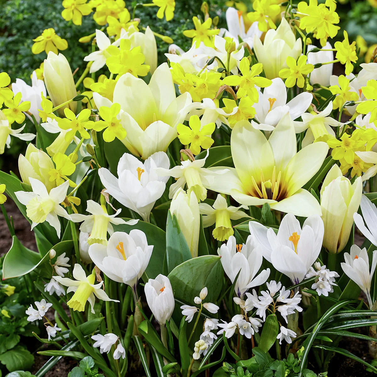 Diese Mischungaus vier quirligen Frühjahrsblühern bringt fröhliche Weiß- und Gelbtöne in vielen Nuancen ins Beet. Die Tulpe Concerto bleibt bei einer Wuchshöhe von 25–35 cm schön kompakt und erblüht in feinem Cremeweiß. Gleich mit mehreren Blüten pro Stiel trumpft daneben die Narzisse Cordubensis auf. Ihre knallgelben Blütenköpfchen sind zahlreich, zauberhaft anzusehen und verströmen einen süßen Duft. Auch sie wächst bis zu 35 cm hoch. Schneeweiß, dafür mit orange-gelben Staubblättern leuchtet der nur 5–10 cm hoch wachsende Krokus Ard Schenk aus der Mischung hervor. Für eine hübsche Untermalung in Weiß-Blau sorgt schließlich die Puschkinie Libanotica. Auch sie wächst nicht höher als 10 cm. Alle vier Sorten sind in ihrer Blütezeit ideal aufeinander abgestimmt und eignet sich gleichermaßen für Beet wie Topf.