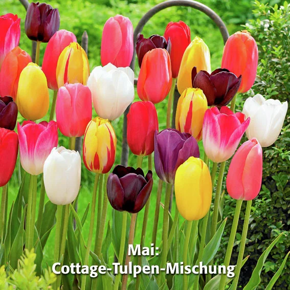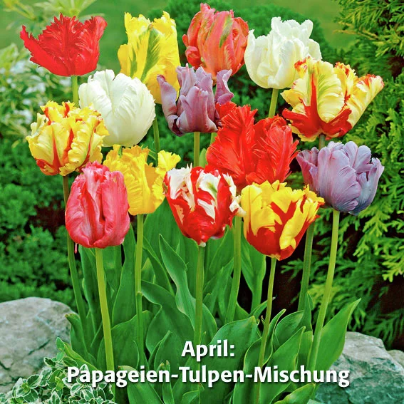 Daran schließen sich ab Ende April die auffallenden Papageien-Tulpen mit ihren verspielt gewellten, gefransten und verdrehten Blütenblättern an. Den Schlußpunkt setzen dann ab Mai die einfachen späten Tulpen, auch Cottage- oder Mai-Tulpen genannt. Sie bilden große Blüten auf langen, stabilen Stängeln und sind ideale Beet- und Schnitttulpen mit einer üblichen Blütezeit bis Ende Mai.