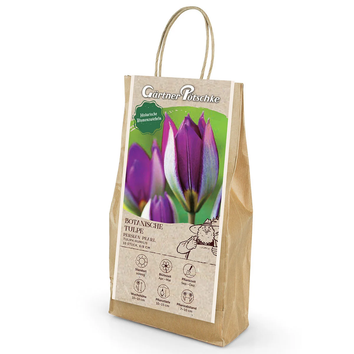 Tipp: Die zu den botanischen oder Wild-Tulpen zählende Zwerg-Tulpe Persian Pearl eignet sich für Beete, Steingärten und auch für Kästen, Töpfe sowie Schalen. Die violetten Blüten erscheinen ab Ende März, sie öffnen sich bei Sonnenschein und zeigen dann ihr gelbes Herz. Persian Pearl ist winterhart und blüht jedes Jahr aufs Neue.
