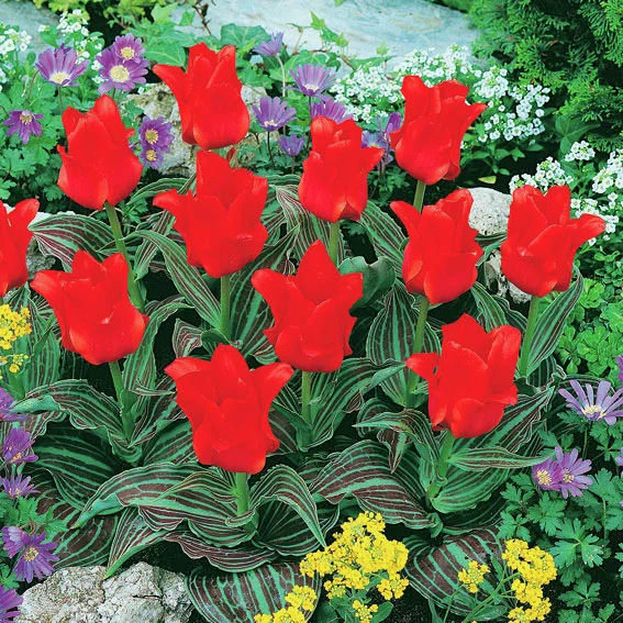 Tipp: Die lange blühenden, niedrigen Greigii-Wild-Tulpen besitzen ein schmückendes, gesprenkeltes oder gestreiftes Laub und blühen ab Mitte April bis in den Mai hinein. Rotkäppchen ist eine altbewährte, robuste, scharlachrot blühende Sorte. Sie eignet sich für den Garten, die Vase und auch für Kästen, Töpfe und Schalen. Greigii-Tulpen sind winterhart und blühen jedes Jahr aufs Neue.
