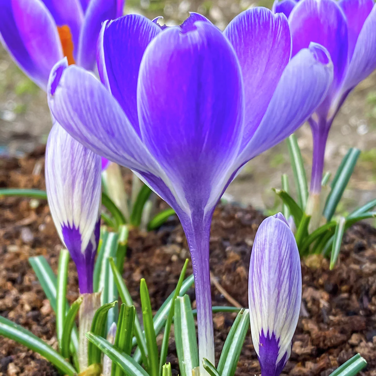 Die großen sechsblättrigen Blüten des Krokus Striped Bird sind innen violett gefärbt. Außen zeigen sie einen hübschen Lavendelton, der von violetten Adern durchbrochen wird. Stilistisch passend dazu zeigt sich das grasartige, feine Blattwerk mit weißer Mittelrippe. Diese Sorte lässt sich gut einbürgern!