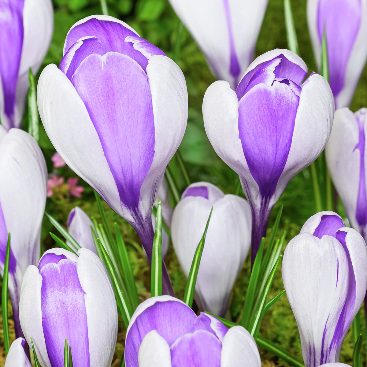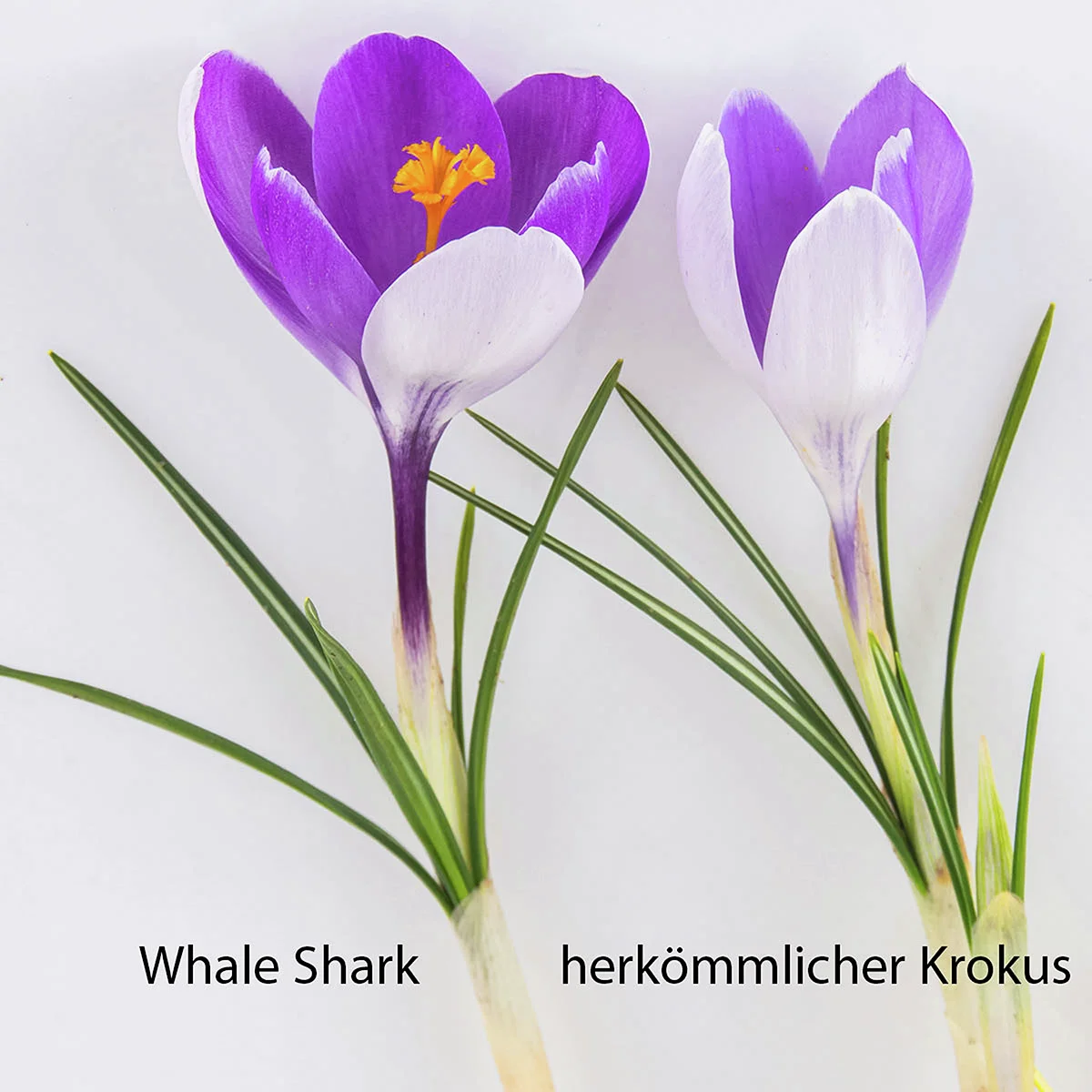Extra früh, farbkräftig und mit bis zu 5 cm großen Blüten heißt Vernus Whale Shark den Frühling willkommen! Die lila-violetten Blütenblätter werden von den für Krokusse typischen, leuchtend orangenen Staubgefäßen wunderbar kontrastiert. Dunkelviolett knüpft der Stiel an die prächtigen Blüten an. Rundum reckt sich das grasartige, frischgrüne Laub gen Himmel. Bienen kommen hier gerne zu Besuch, wohingegen Wildtiere die Sorte meiden. So brauchen Sie nicht zu befürchten, dass die kleinen Frühjahrsblüher von Vögeln und Co. gefressen werden. Vernus Whale Shark ist mehrjährig, gut winterhart und eignet sich hervorragend zum Verwildern. Die Zwiebeln gedeihen in jedem Boden, bevorzugen sonnige bis halbschattige Standorte und eignen sich auch für die Pflanzung im Topf.