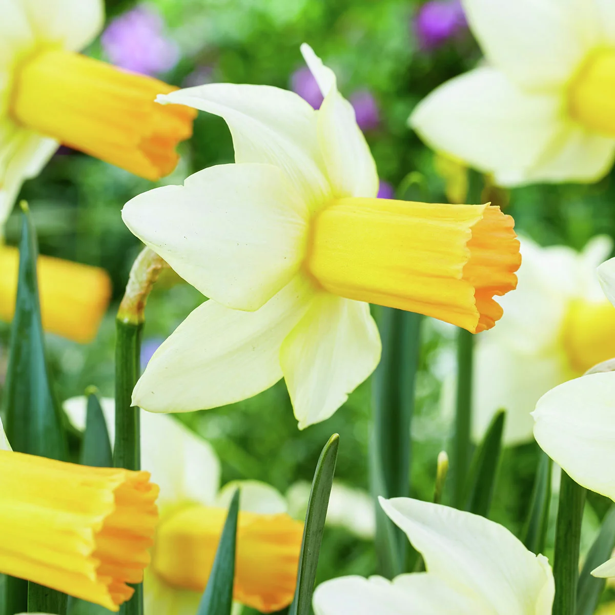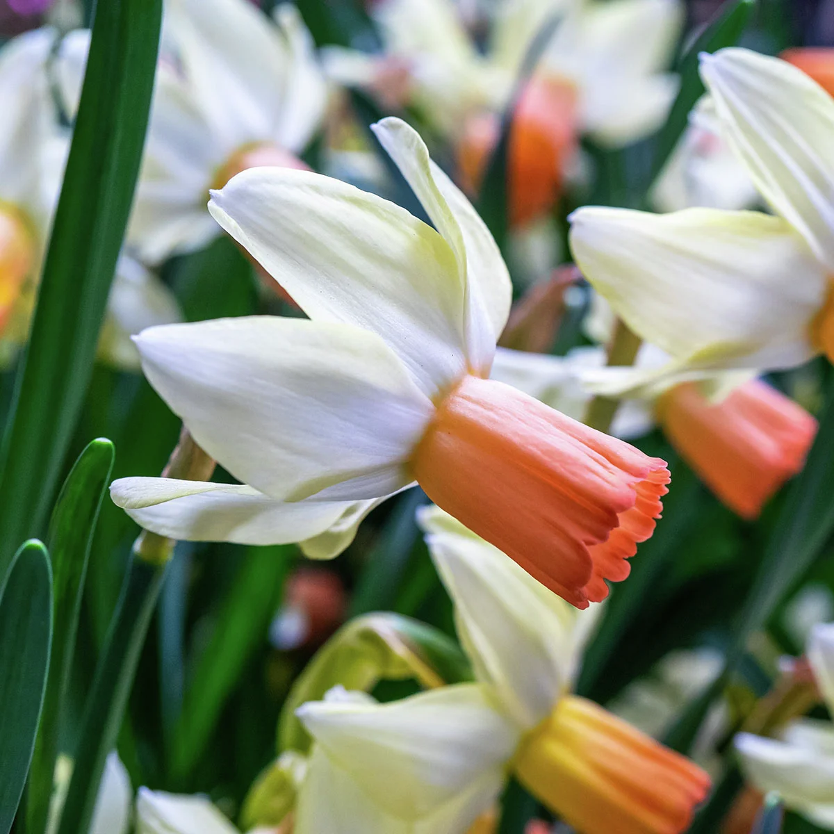 Mit den nach hinten gezogenen, cremeweißen und reflektierenden Blütenblättern zieht diese Mischung schönster Alpenveilchen-Narzissen alle Blicke auf sich. Die Sorte Terry trumpft zusätzlich mit zart orangener, apricotfarben ausreifender Nebenkrone auf. Carice setzt hingegen auf eine zartrosa Mitte. Harmonisch ergänzt sich diese stimmige Mischung gleichermaßen in Beet, Topf und Vase.
