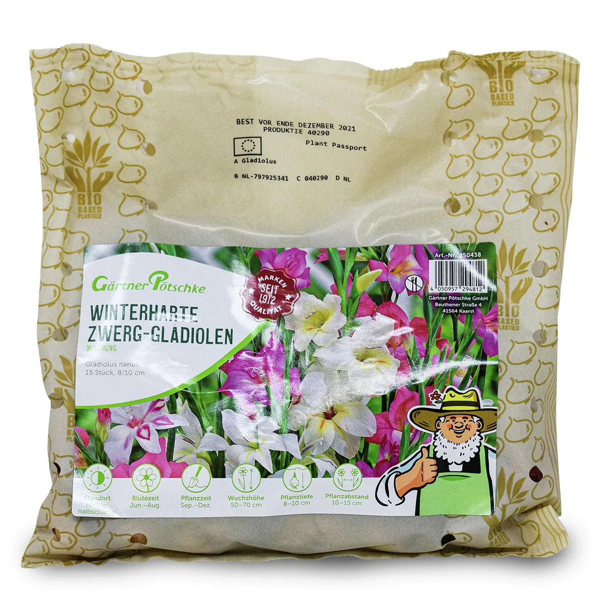 Zwerg-Gladiolen sind mit leichtem Winterschutz aus Kompost, Laub oder Reisern winterhart und blühen im folgendem Sommer früher als im Frühling gepflanzte Gladiolen. Ihre Blühfreudigkeit lässt aber ab dem zweiten Sommer rasch nach. Deshalb empfehle ich, diese Gladiolen lieber jedes Jahr neu zu pflanzen.