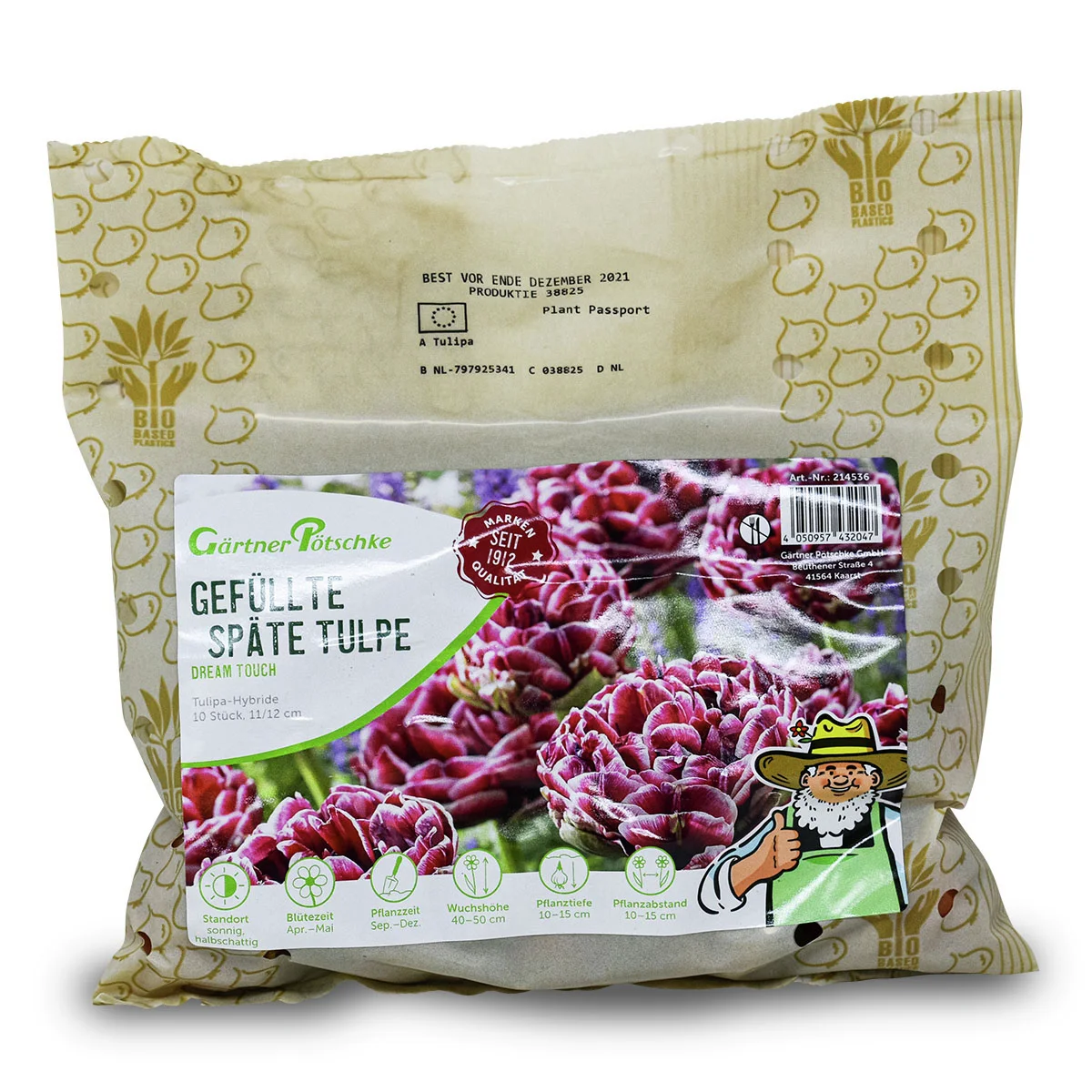 Was für ein Anblick! Voll gefüllte, schalenförmige Blüten mit silbernen Rändern verleihen der gefüllten späten Tulpe Dream Touch ein exotisches Aussehen. Die traumhaften Blüten thronen auf stabilen sattgrünen Stielen. Schmücken Sie Beet oder Kübel mit dieser Tulpe. Ideal auch als Schnittblume!
