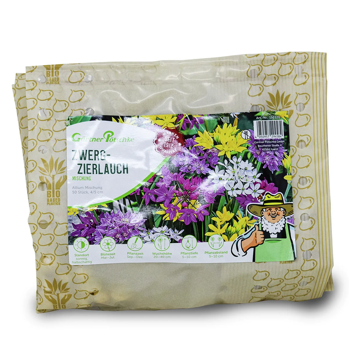 Sie erhalten einzeln verpackt und etikettiert je 10 Zierlauch-Zwiebeln: