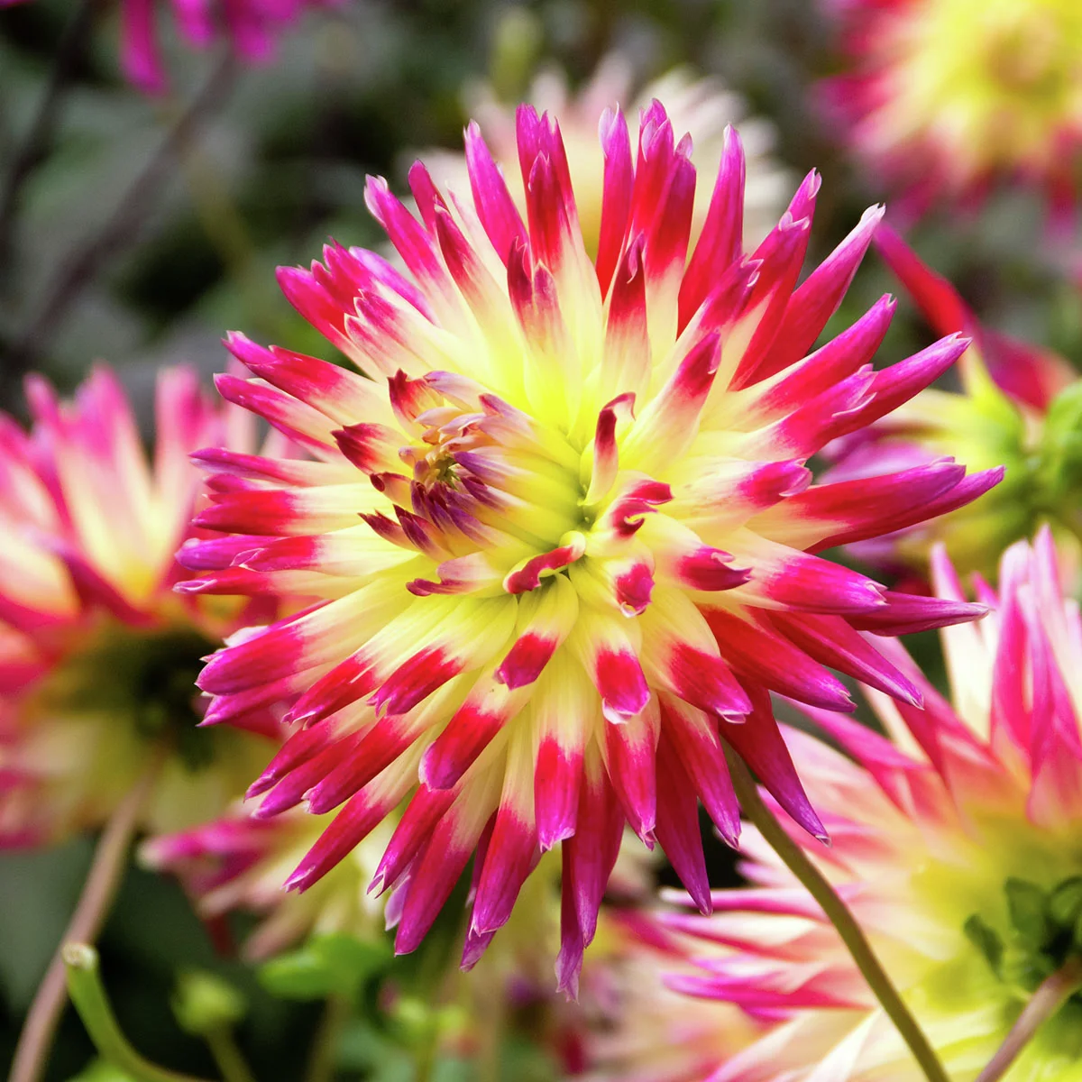 Tipp: Die gerollten, spitz zulaufenden Blütenblätter verleihen diesen Dahlien ein stacheliges Aussehen, daher der Name Kaktus-Dahlien. Tahiti Sunrise ist eine wüchsige Garten- und Schnittdahlie und muss rechtzeitig gestützt werden. Im Sommer verblühte Blütenköpfe regelmäßig zur Förderung neuer Blüten ausputzen. Zum Überwintern die Dahlien-Knollen im Herbst vor den ersten strengen Frösten handbreit über dem Boden zurückschneiden, vorsichtig ausgraben, anhaftende Erde leicht abklopfen und in einem kühlen, luftigen Raum bis zum Frühjahr lagern.