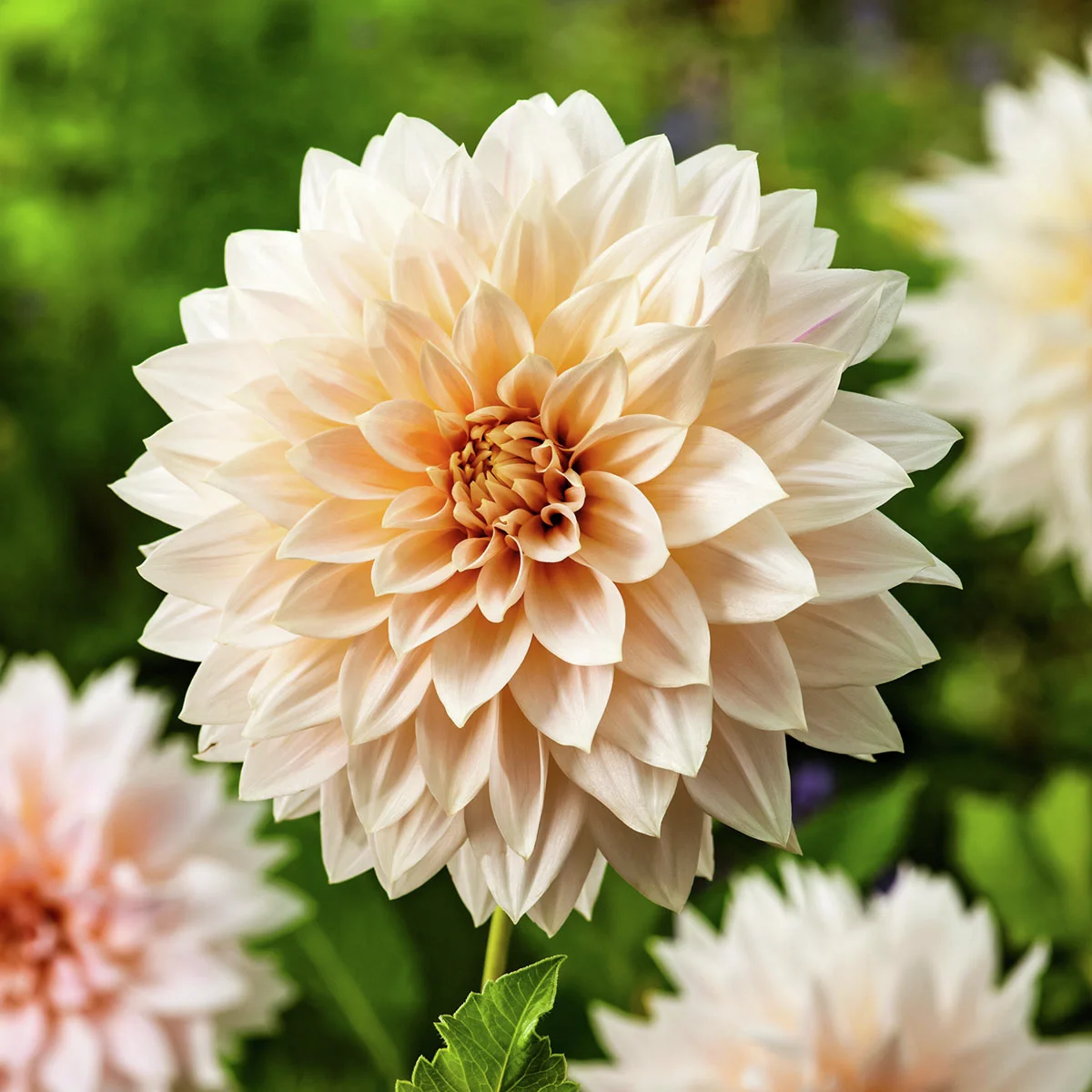 Mit ihren opulenten, cremeweiß bis zart apricotfarbenen Blüten weiß die Schmuckdahlie Cafe au Lait wirklich zu beeindrucken. Sie wachsen zu einem stattlichen Durchmesser von bis zu 25 cm heran – nicht umsonst nennt man diese Blütenform Dinnerplate Size. Damit ziert diese Schmuckdahlie nicht nur Beete, Kübel und Töpfe meisterhaft, auch in der Vase macht sie mächtig Eindruck.