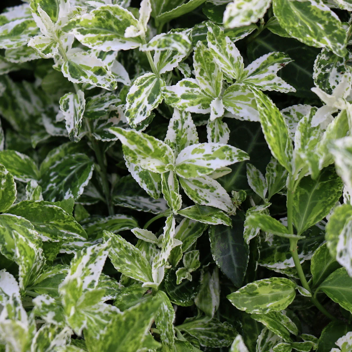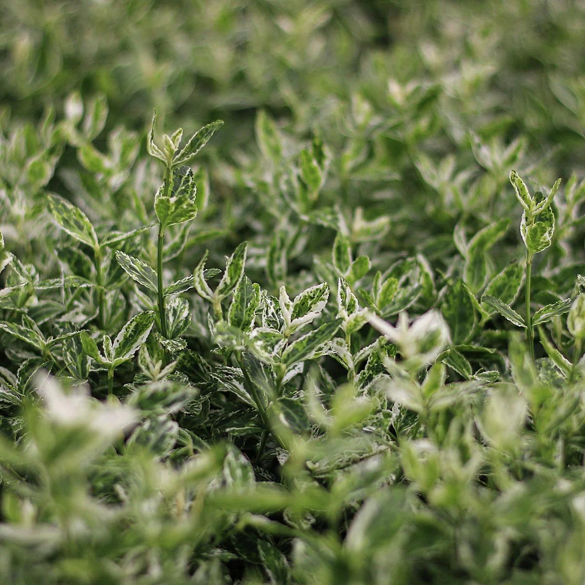 Weiße Triebspitzen mit grünen Blättern und weißen Sprenkeln, so zeigt sich Harlequin von ihrer besten Seite. Im Winter verwandelt sie ihren Rand in eine Rosatönung.