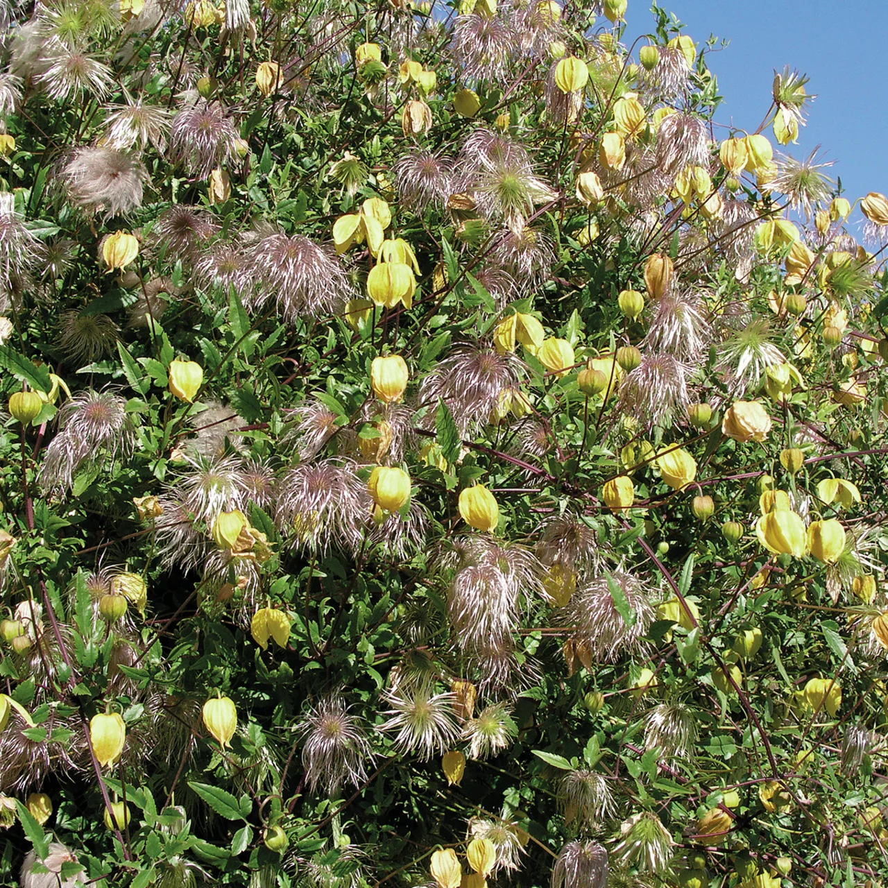 Die Mongolei-Waldrebe wächst kraftvoll und erreicht eine Höhe von bis zu 4-6 Metern. Mit ihrem weitläufigen, locker verzweigten Wuchs sorgt sie für dichte, grüne Ranken, die ab Juni bis Oktober ihre zarten, goldgelben Blüten in schirmartigen Trauben präsentieren. Die Pflanze bildet nach der Blüte dekorative, silbrige Fruchtstände, die besonders im Herbst und Winter einen schönen Anblick bieten.