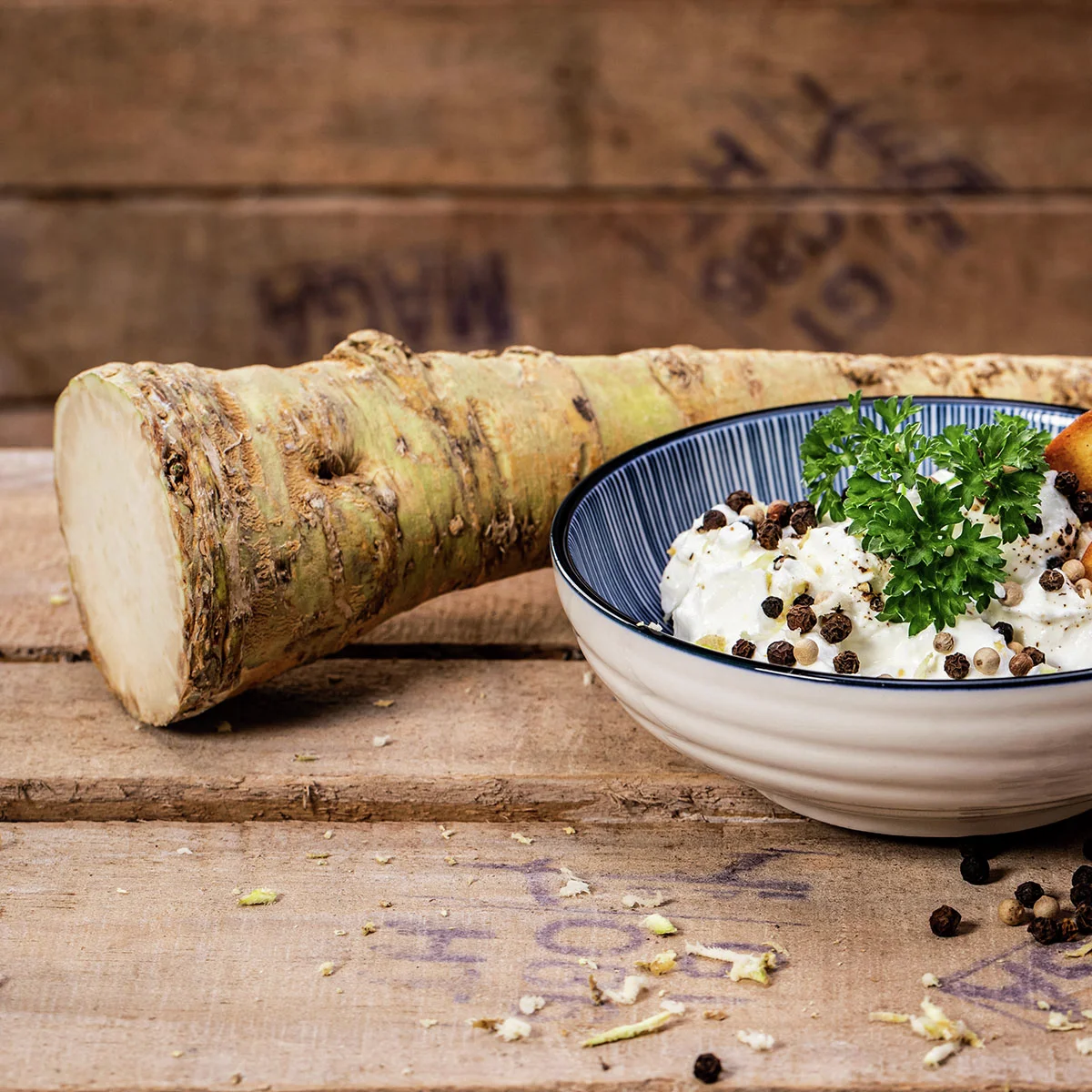 Die scharfen Wurzeln können Sie laufend in kleinen Mengen ernten, indem Sie eine der Seitenwurzeln vorsichtig freilegen und abschneiden. Der Geschmack passt hervorragend zu Gemüse, Fleisch, Dips und Soßen. Neben der beliebten Schärfe versorgt Vitara® Sie mit wichtigen Ballaststoffen, Eisen, Kalium, Vitamin B1, B2, C und Zink. Die enthaltenen Allyl-Senföle sind, wie bei Senf und Wasabi, für die Schärfe verantwortlich und werden erst freigesetzt, wenn die Wurzel geschabt wird.
