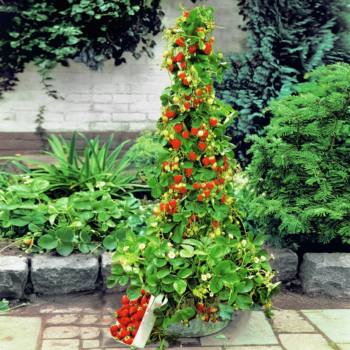 Schon ein einziges Exemplar dieser immertragenden Klettererdbeere beschert Ihnen vom Frühsommer bis zum ersten Frost eine reiche Ernte der beliebten roten Frucht. Ideal für den platzsparenden Anbau auf Terrasse und Balkon!