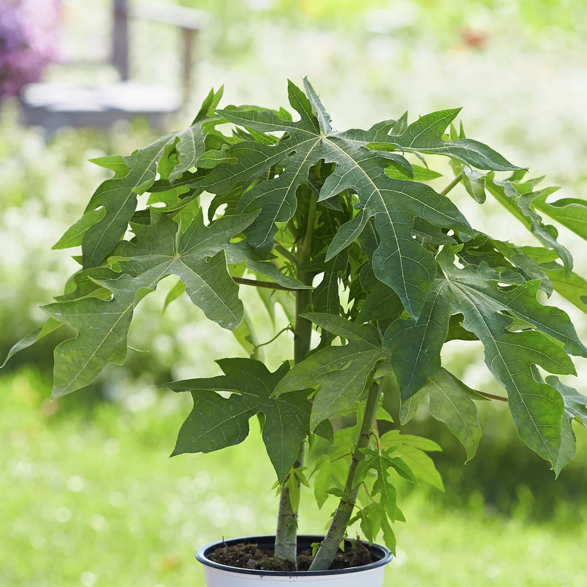 Die Papaya hat ihre Heimat in den Tropen zwischen Mexiko und Bolivien und fühlt sich dementsprechend an einem sonnigen und warmen Platz im Garten, auf dem Balkon oder der Terrasse wohl. Das Substrat sollte nährstoffreich und durchlässig sein. Die Kübelhaltung ist empfohlen, denn die exotische Staude sollte hell und warm, bei etwa 10–15 °C überwintert werden. Im Sommer sie viel und regelmäßig Wasser, während der Winterruhe darf es ein bisschen weniger sein. Vor allem während der Blütezeit und Fruchtbildung ist zusätzlich wöchentlich eine Gabe eines Flüssigdüngers empfohlen. Sie ist pflegeleicht und benötigt keine Schnittmaßnahmen, Ihr Wuchs ist von Natur aus eher locker.