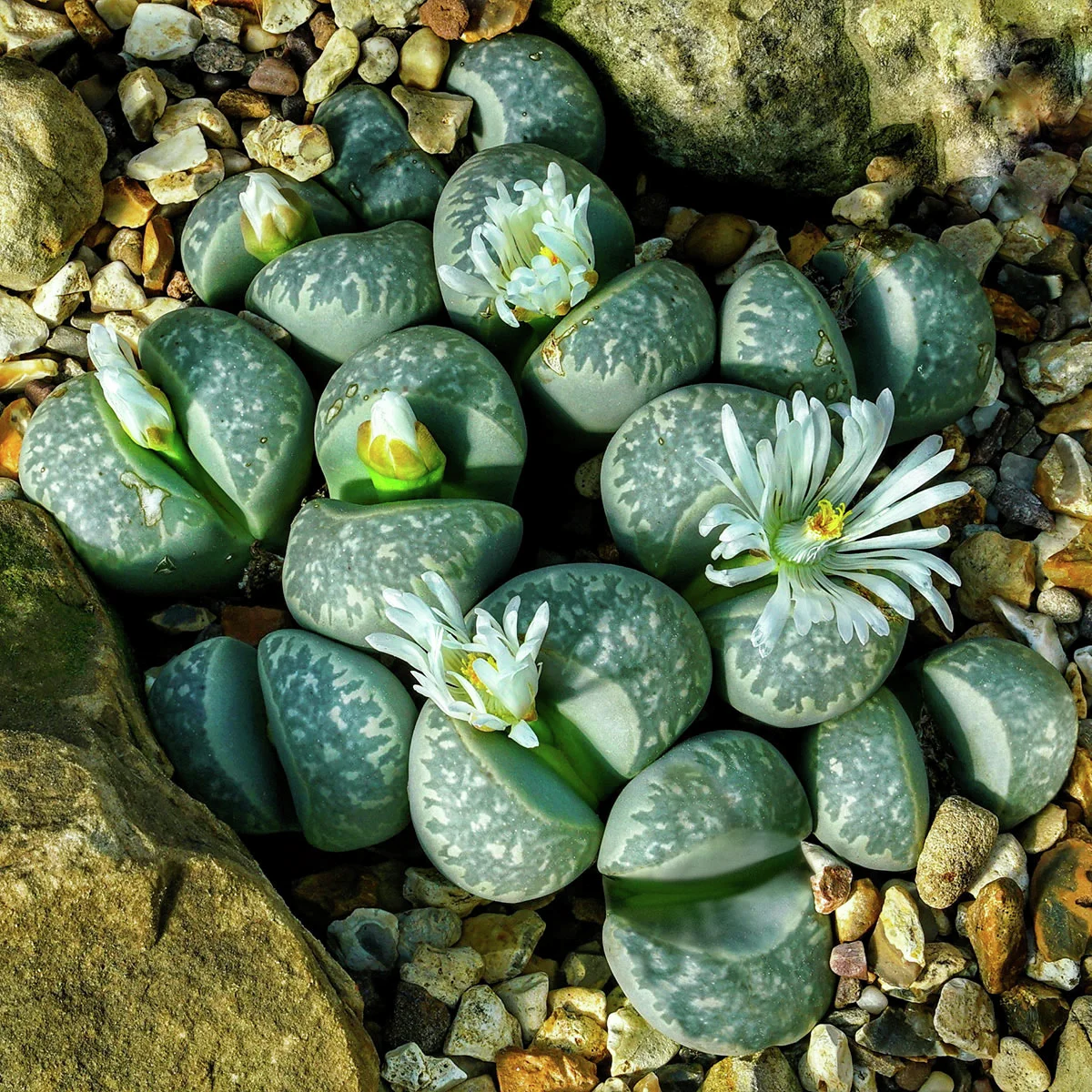Pflegeleichte Zimmerpflanzen: Conophyten, auch bekannt als Lebende Steine, sind ideale Pflanzen für Liebhaber von pflegeleichten Zimmerpflanzen, da sie in ihren dicken Blättern Feuchtigkeit speichern können.