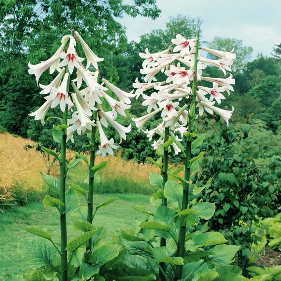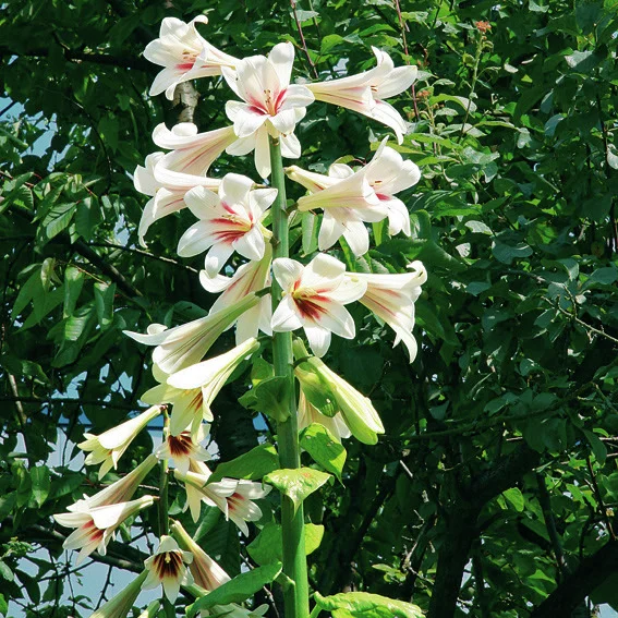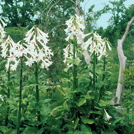 Tipp: Eine imposante Garten-Erscheinung mit Wuchshöhen über 300 cm und riesigen, duftenden Trichterblüten. Bis zur ersten Blüte benötigt die Riesen-Lilie allerdings 3-5 Jahre, schmückt jedoch schon in dieser Zeit mit ihren herzförmigen Blättern. Nach der Blüte stirbt die Zwiebel ab. Bis aus den zuvor gebildeten Brutzwiebeln wieder Blüten erscheinen, dauert es wiederum einige Jahre. Riesen-Lilien sind winterhart, ein guter Winterschutz aus Kompost, Laub oder Reisern ist empfehlenswert.