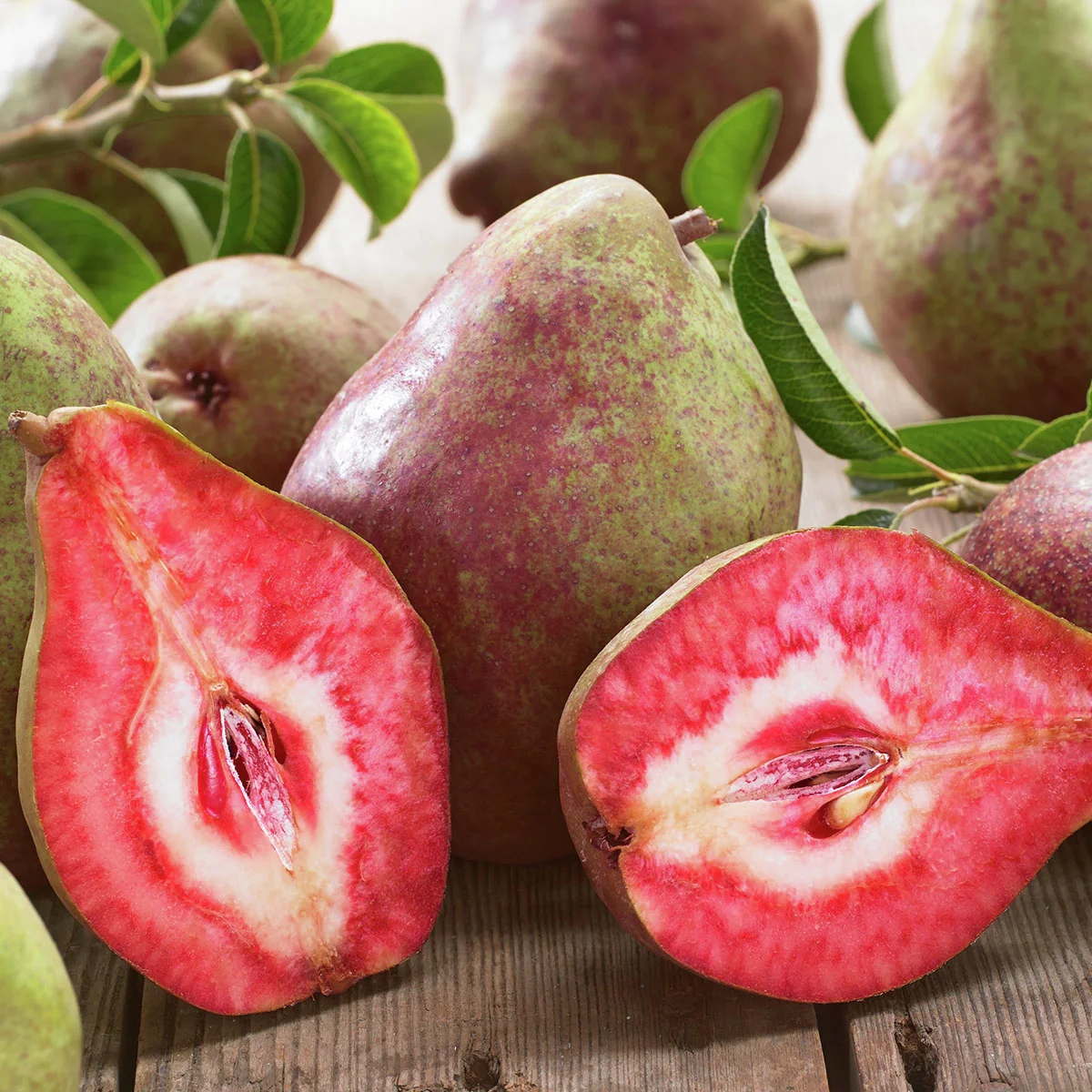 Die Obstwelt steckt voller Überraschungen. Und eine dieser ist die Blutbirne. Sie birgt nämlich ein rot durchzogenes Fruchtfleisch! Doch nicht nur ihre Färbung macht sie so begehrt, sondern auch das saftige, zart schmelzende Aroma. Sie trägt früh und beschert Ihnen hohe Ernten. Holen Sie sich diese historische „Taschenbirne“ in Ihren Garten und überraschen Sie Familie und Freunde mit rotfleischig durchzogenen Birnen!