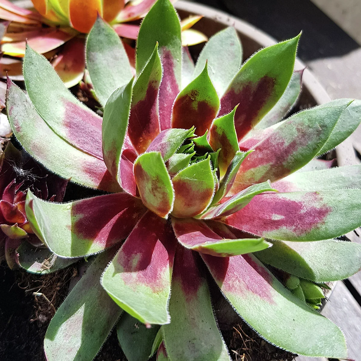 - Prächtige Blattrosetten in Olivgrün und Rot