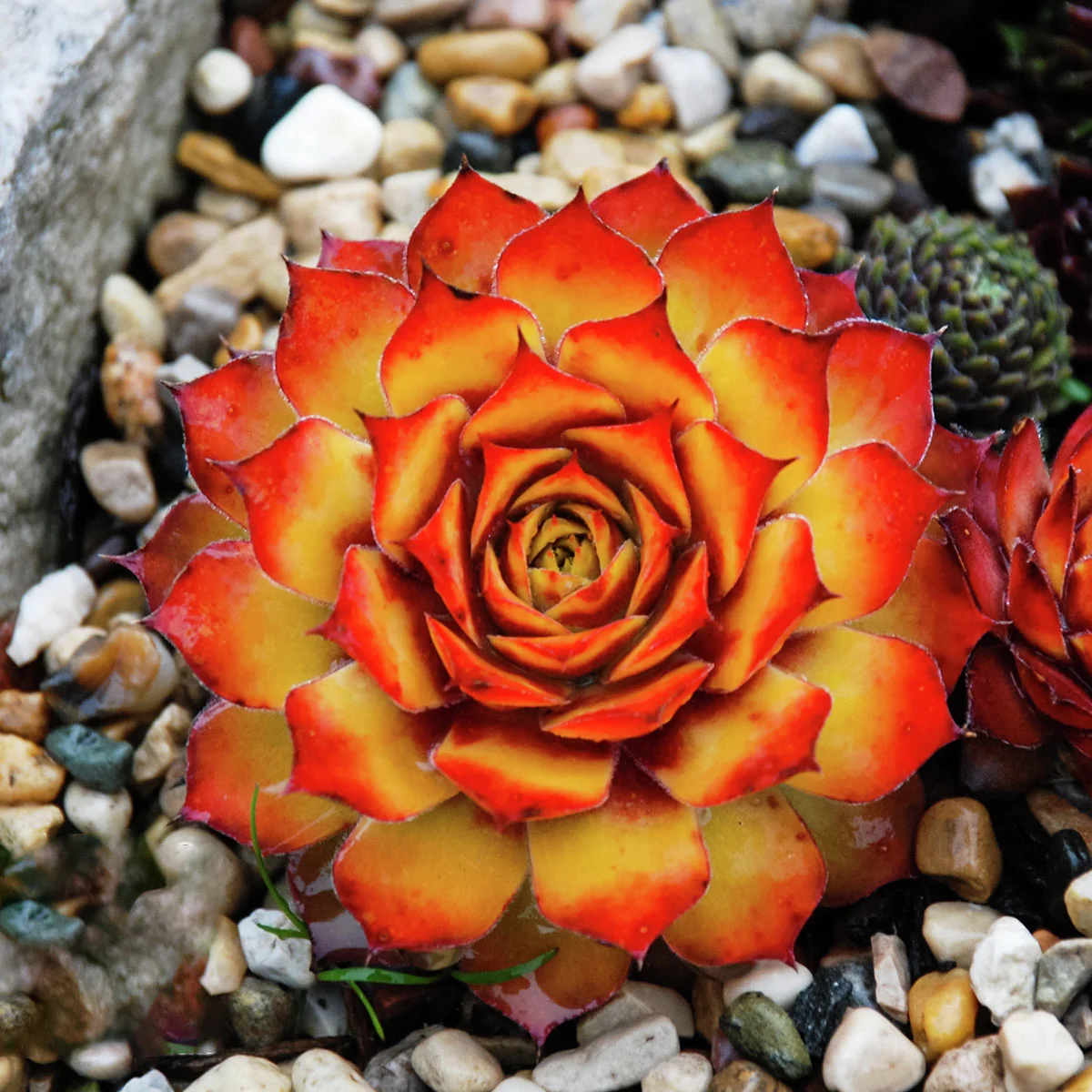 Ein Sempervivum in diesen außergewöhnlichen Farben haben Sie noch nicht gesehen: In sonnigen Gelb- und Orangetönen leuchten die dickfleischigen, spitz zulaufenden Blätter weithin. Und das auch im Winter, denn Golden Nugget ist immergrün! Über das Jahr variiert ihr Farbton von Honiggelb über Limettengrün bis hin zu Neongelb mit orange-roten Spitzen. So erscheinen die einzelnen Blätter zwischenzeitlich wie lodernde Flammen. Gemeinsam bilden sie eine mittelgroße Rosette, die nach und nach von niedlichen Tochterrosetten umgeben wird. Ihr Wuchs ist dabei niedrig und flach, gerade einmal eine Höhe von 8 – 15 cm erreichen die Pflanzen. Nicht so, wenn sich nach einiger Zeit eine Blüte zeigt: Diese thront dann weit über der Rosette, sternförmig und in feinem Rosa und wird auch von Insekten sehr geschätzt.