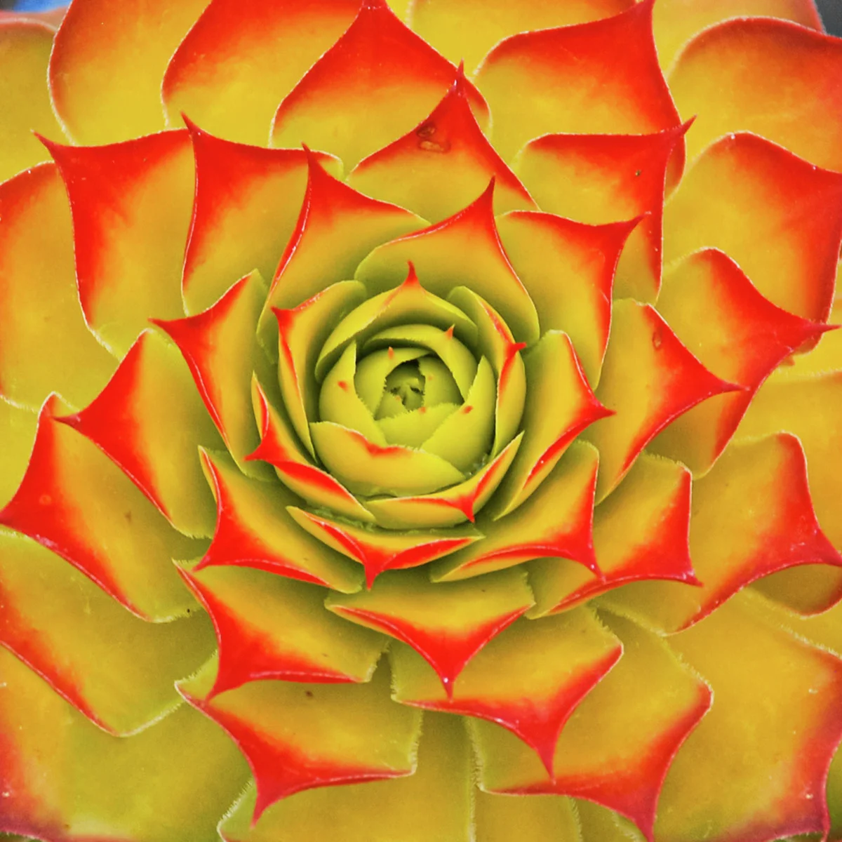 - Gelbe Blattrosetten mit rot-orangen Spitzen