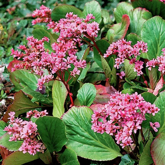 Die anspruchslose Bergenie bringt zum Jahresende hin mit der roten Herbst- und Winterfärbung ihrer bei uns immergrünen Blätter Farbe ins Beet. Sowohl das optisch auffallende Laub wie auch die glockenförmigen Blüten können gut für die Vase geschnitten werden. 7 Stück pro qm.