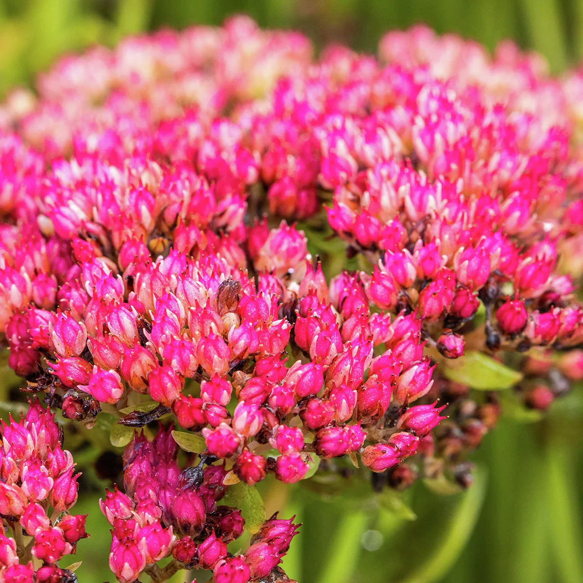 Prachtvolle doldenförmig angeordnete Blüten in Pink mit wunderschöner Färbung, die im Spätsommer, zwischen August und Oktober noch an Intensität zunimmt, krönen das sattgrüne, dickfleischige Laub von Seduction Green Pink. Ihr Wuchs ist buschig und zugleich kompakt. Als eher niedrige Randbepflanzung, im Staudenbeet oder als vielblütiger, leuchtender Bodendecker bietet die sommergrüne Staude besonders als Gruppenpflanzung einen fabelhaften Anblick und wertet auch trockene Bereiche im Garten auf, die dadurch eine lebendige, farbige Note erhalten. Viele Fans hat sie nicht nur unter den Blumenfreunden, Insekten umschwirren sie begeistert und laben sich an ihren Blüten. Gefräßige Schnecken hingegen lassen Secuction Green Pink links liegen. Gut so!